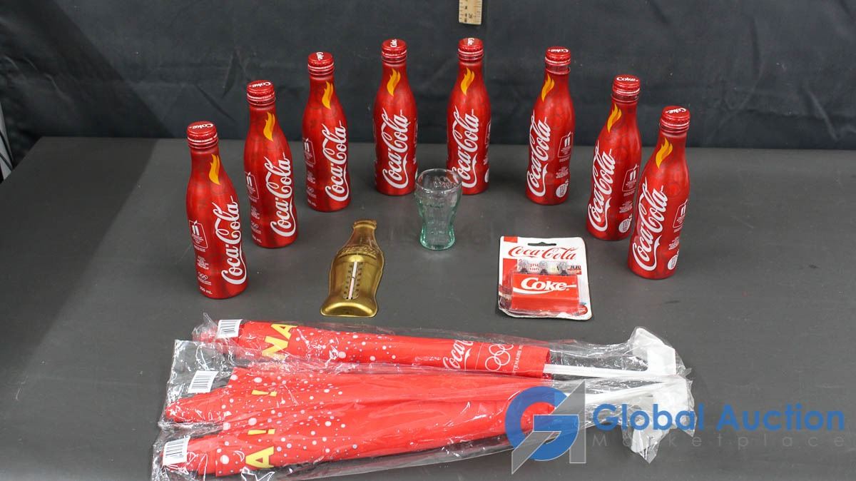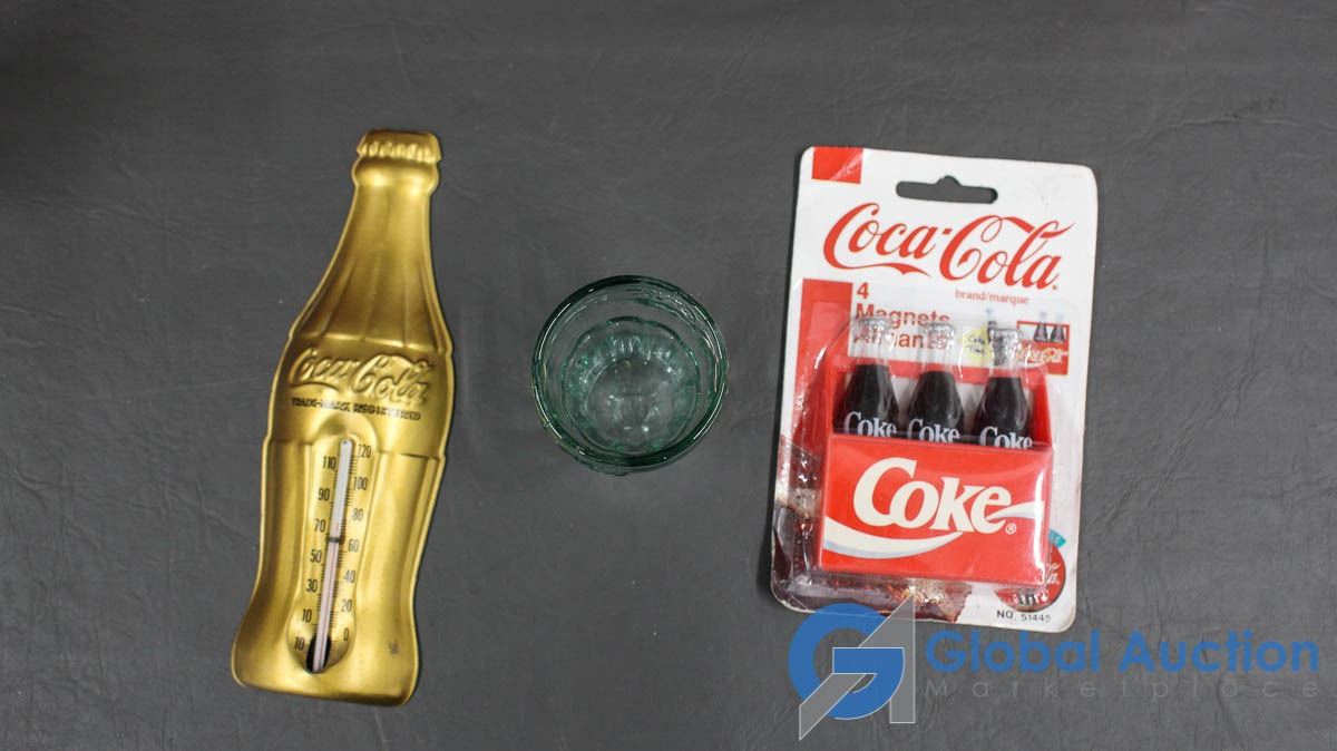 8 Coca Cola Collector Bottles, 3 Car Flags, Mini Glass, Thermometer & Magnets