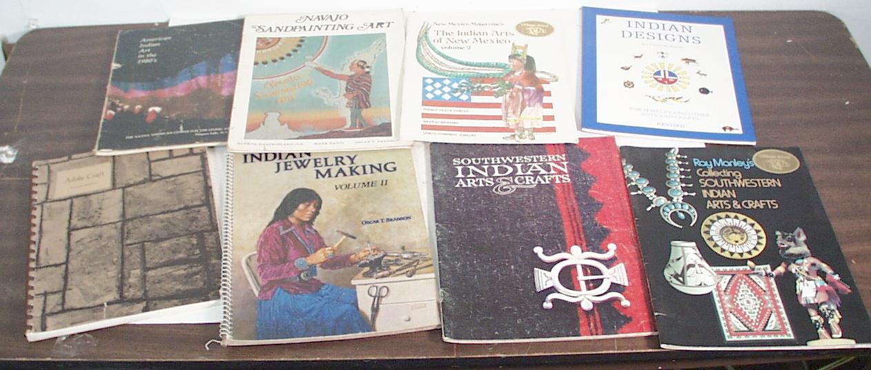 8 books on Indian subjects. 1) Adobe Craft Illustrated Manual. 56 pages. 1972. Good condition, some cover tearing. 2) Indian Jewelry Making Volume II by Oscar T. Branson. Softcover. 64 pages. 1979. Spiral bound. Many color photos. 3) Southwestern Indian Arts & Crafts. Softcover. 48 pages. 1983. Good condition. 9" x 12".Many color photos. 4) Ray Manley's Collecting Southwestern Indian Arts & Crafts. Softcover. 1979. Very good condition. 9" x 12". Many color photos. 5) American Indian Art in the 1980s. Softcover. 8-1/2" x 11". 78 pages. Shows much use. 6) Navajo Sandpainting Art by Mark Bahti. 32 pages. 1978. Many color photos. Good condition, some cover wear. 7) New Mexico Magazine's The Indian Arts of New Mexico Volume 2. 48 pages. 1977. 8-1/2" x 11". Good condition. Pueblo Fiesta Dances, Navajo Weaving, Santo Domingo Jewelry. 8) Indian Designs by Connie Asch for jewelry and other arts and crafts. Softcover. 64 pages. 1990. Black and white images. Good condition.