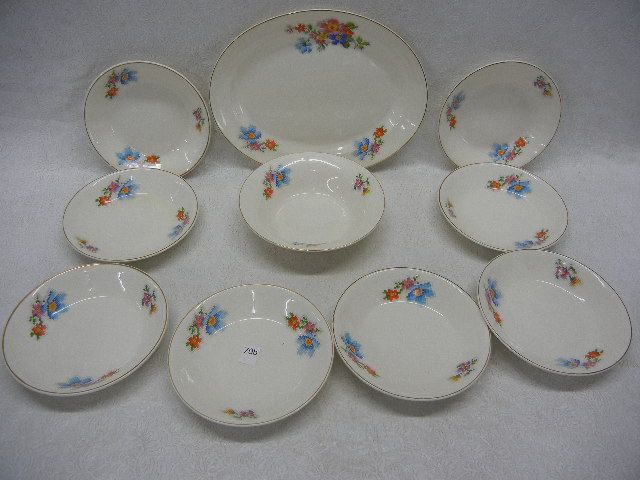 (8) Cross Stitch Pattern Bowls, 1 Serving Bowl, and 1 Platter