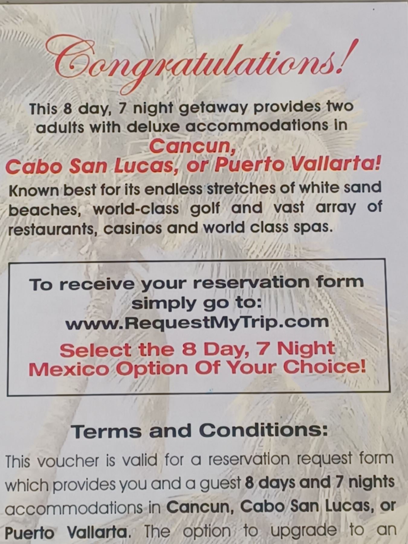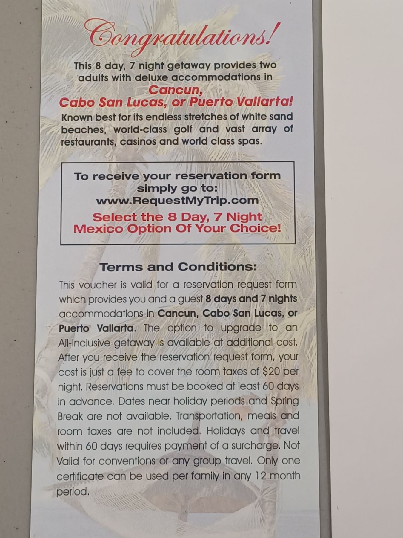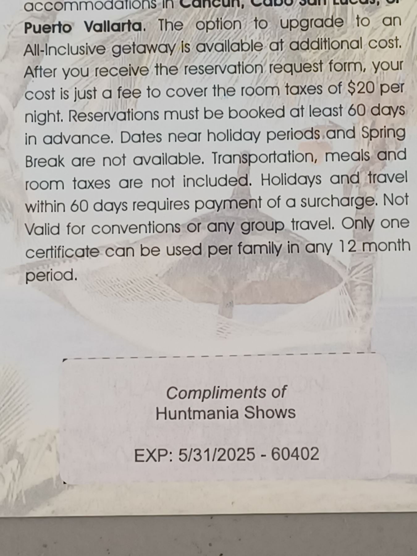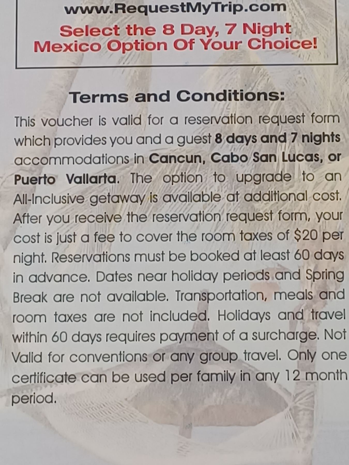 8 DAY/7 NIGHTS MEXICO HOTEL PACKAGE FOR TWO EXPIRES 06/30/2025 NO AIRFARE, CAN BE UPGRADED TO ALL-INCLUSIVE