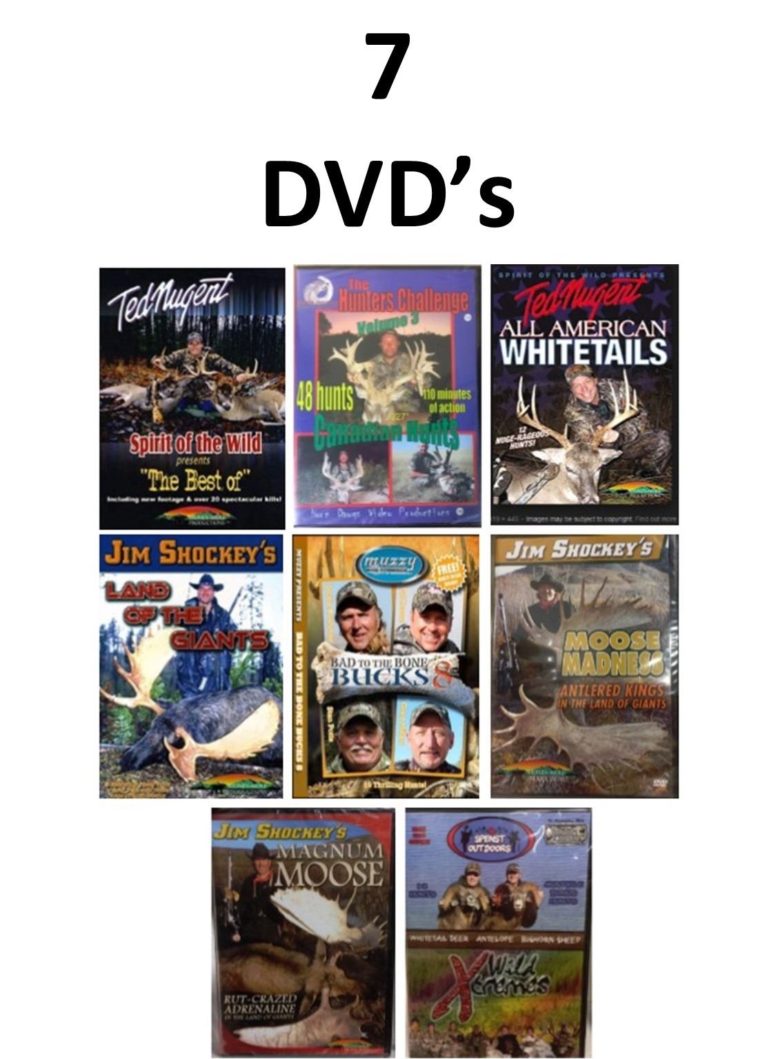 8 DVD's, Spirit Of The Wild, The Hunters Challenge 3, All American Whitetails, Jim Shockey's Land of The Giants, Bad to the Bone BUCKS 8, Moose Madness, Magnum Moose, Xtreme Wild
