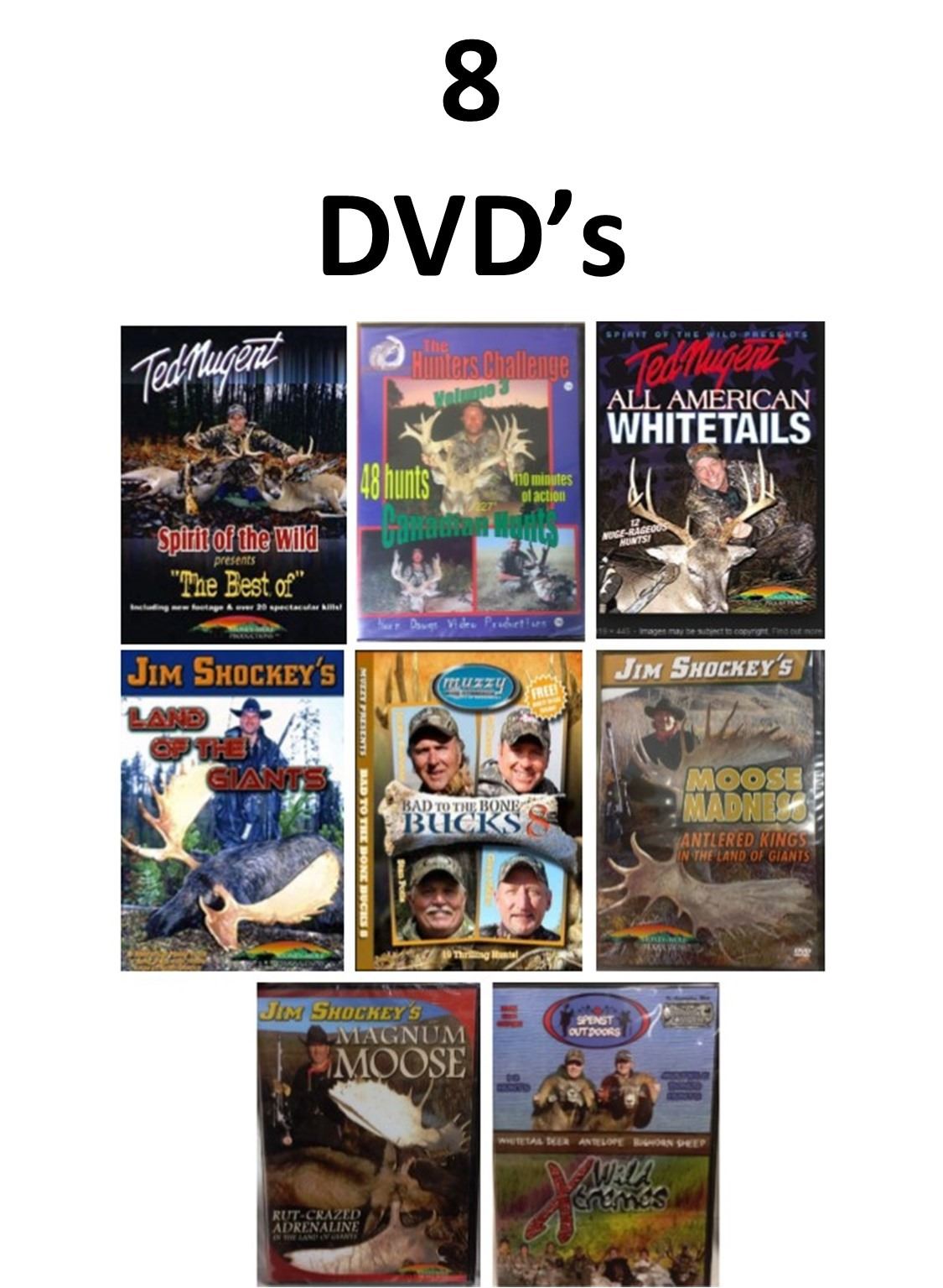 8 DVD's, Longbeard Madness 16, The Hunters Challenge 3, All American Whitetails, Jim Shockey's Land of The Giants, Bad to the Bone BUCKS 8, Moose Madness, Magnum Moose, Xtreme Wild