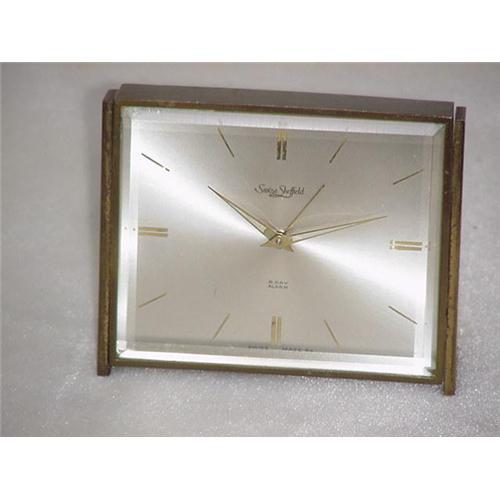 A Swiza-Sheffield 8-day alarm clock, brass case, 4" long X 3 1/4" tall. Beveled glass crystal. Made in the 1960's in modern style with clean lines. Two brass legs hold clock 1/4" above table,one leg loose screw inside case(can be fixed). Slight chips on corners of beveled glass crystal. Clock does run and alarm works. Very nice for the clock enthusiast.