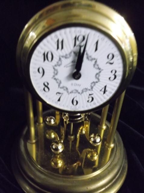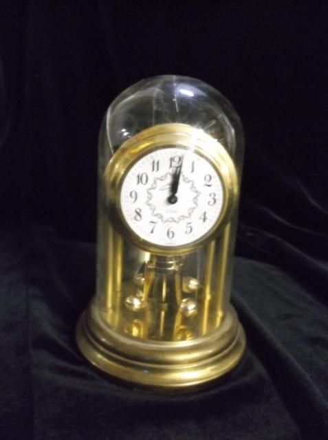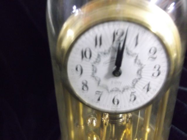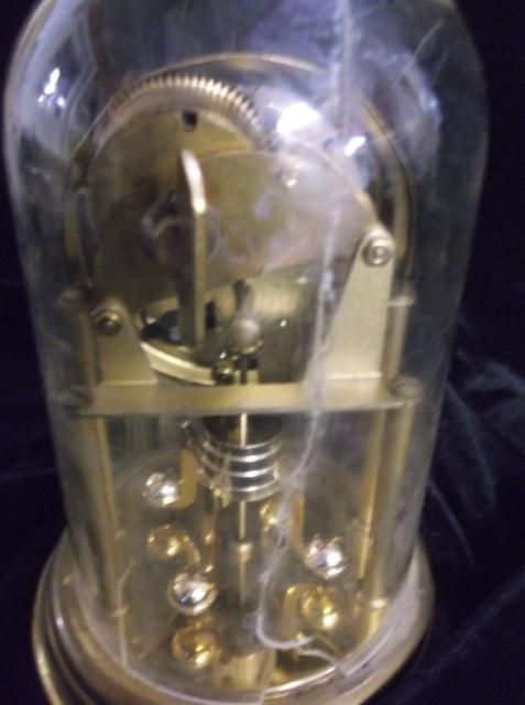 has a plastic dome cover which is cracked and piece chipped off. the clock works great the weights on bottom turn to keep the time moving. dome is easy replacement.