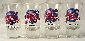 This is a lot of 8 RARE shot glasses from Planet Hollywood. All are from closed locations! They are in mint, never used condition. Each 3 1/2" tall flared glass features the blue globe and red lettered Planet Hollywood logo. Underneath in black lettering are the names of the individual locations. Those locations are:Boston (very rare) Cabo San Lucas (Mexico) Chicago Dallas Edmonton (Canada) Frankfurt (Germany) Ft. Lauderdale Key West Identical Planet Hollywood shot glasses have sold on auction for over $116.00. This is a great lot of hard to find Planet Hollywood collectibles. Please check out our other auctions featuring rare Planet Hollywood shot glasses.
