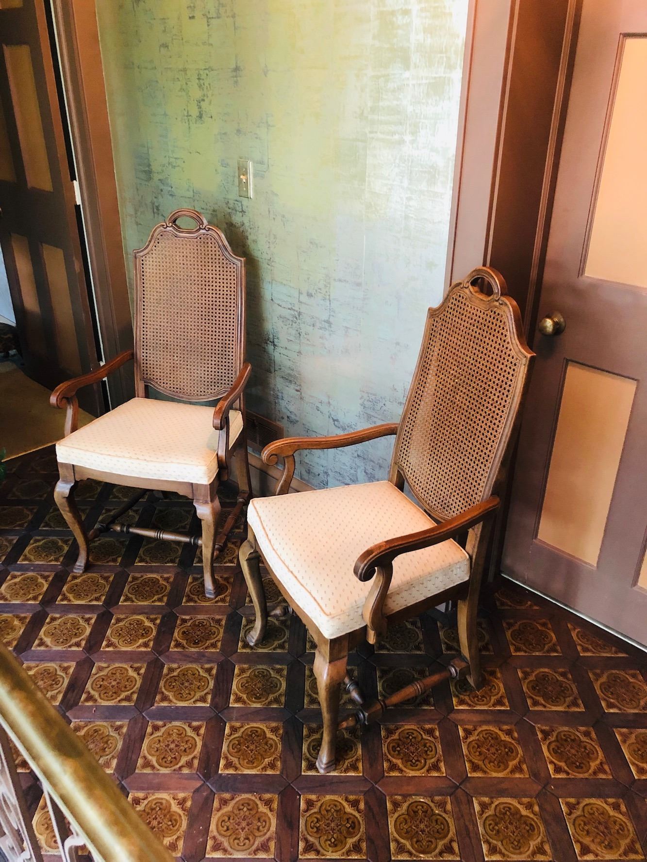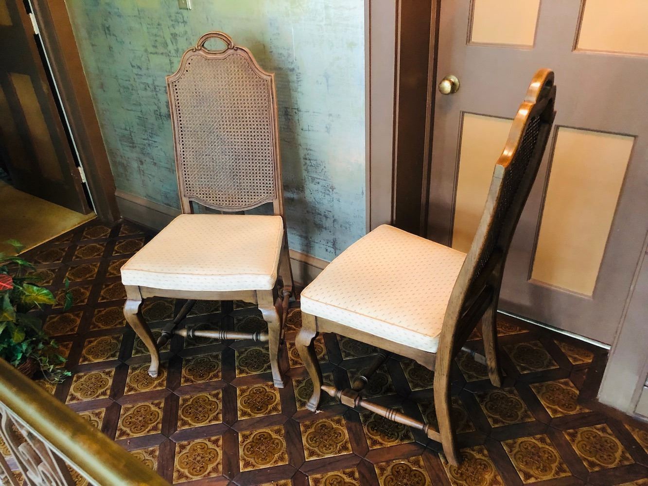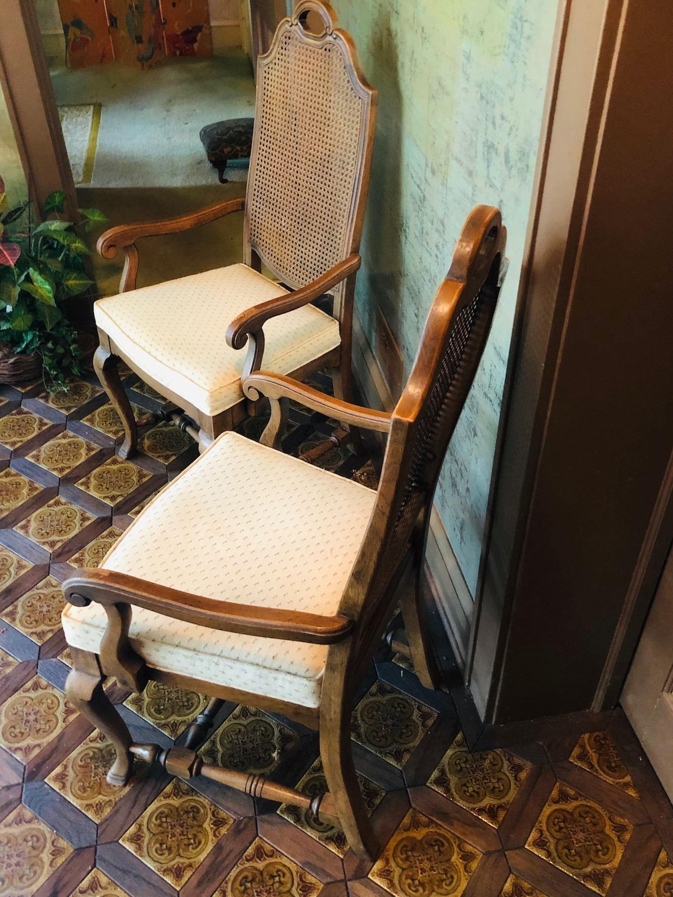 Set of 8 dining chairs, nice upholstered chairs with caned backs, 6 side chairs and 2 arm chairs. Being sold to benefit St. Jude Children's Research Hospital