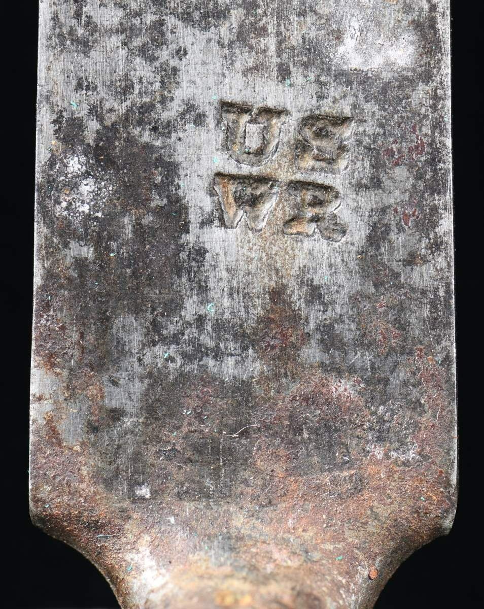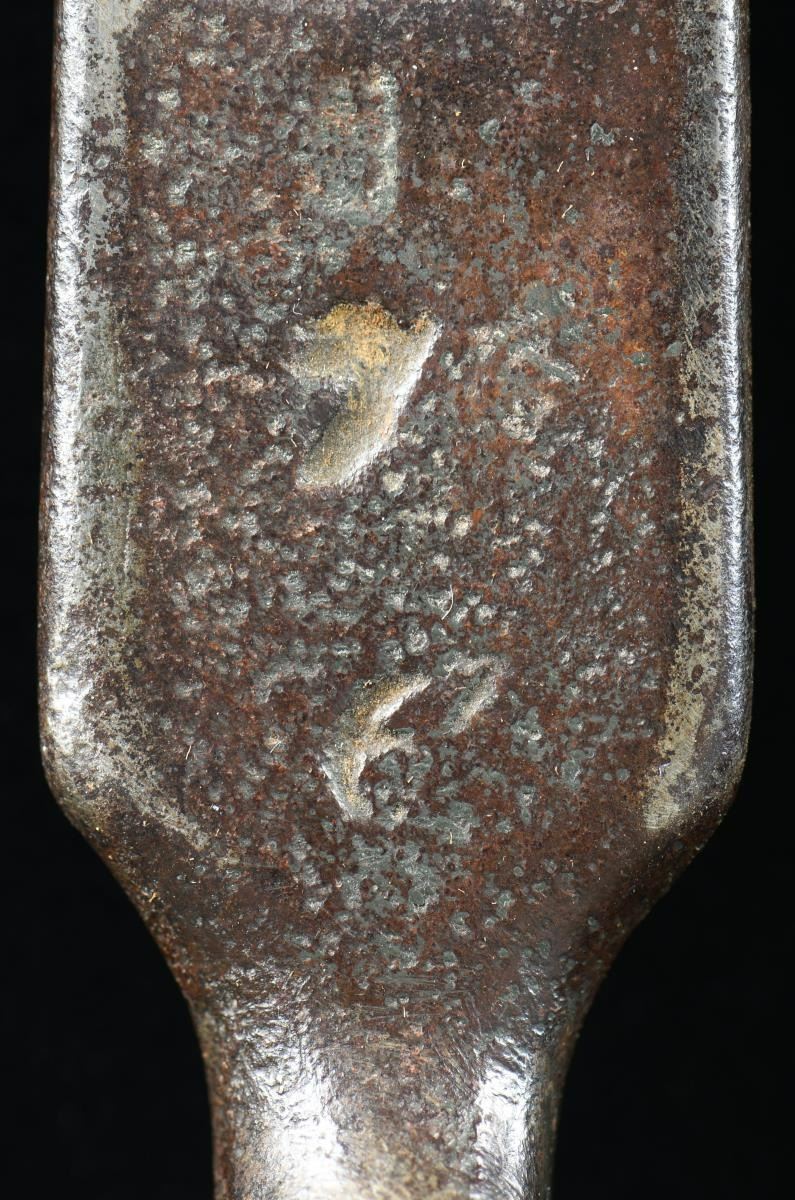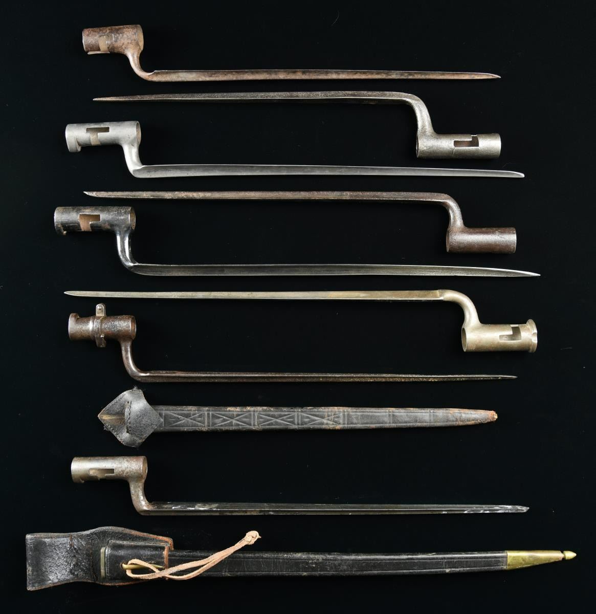 1) US M1808/12 bayonet measuring 17" overall with a 3 5/16" socket and a 12 3/4" blade. The blade is marked with a small "IN" and a large "US". See 4 variation 3 on page 20 of Hardin. CONDITION: blade has a cleaned, dark gray patina with some evidence of pitting and small separation at the mortise. 2) A US M1795-1808 transition bayonet measuring 20 1/8" overall with a 3 1/8" socket and a 16 5/8" blade. The flat of the blade is stamped near the elbow with an inspector's mark in the shape of an 8. The socket is clearly stamped "A" in front of the mortise. CONDITION: bayonet has a worn blued finish that appears to have been added some time in the 20th century. 3) US, late 18th century bayonet possibly by J.J. Henry. Bayonet measures 18" overall with a 2 1/4" socket and a 14 7/8" blade. There is a large, deeply stamped "X" on the flat of the blade near the elbow. No other markings are present. CONDITION: bayonet has a dark overall patina. 4) An American copy of a British land pattern bayonet with an overall length of 19 1/2". The socket measures 2 7/8", and the blade measures 15 3/4". The entire bayonet is unmarked. CONDITION: bayonet has a medium gray patina. 5) US State of Maryland contract bayonet measuring 17 3/8" overall with a 2 5/16" socket and a 14 1/4" blade. The flat of the blade is stamped "M * X". The flat is also stamped with a small "RA" in two places. CONDITION: bayonet has an overall dark patina with some oxidation but little pitting. 6) A US M1816 bayonet measuring 19" overall with a 3" socket and a 15 3/4" blade. The only mark on the bayonet is two dots near the elbow. CONDITION: blade has a light gray overall finish. 7) A French M1777 Charleville bayonet for the AN IX flintlock musket. Bayonet measures 18 5/8" overall with a 2 1/8" socket and a 15 3/8" blade. Blade has several stampings on the flat near the elbow. The socket is also profusely marked with what appears to read "IIIIS I.C.N.95". The bayonet is housed in a nicely incised leather scabbard, likely of American manufacture. CONDITION: bayonet has a lightly cleaned, dark finish with universal light pitting. The scabbard generally shows light wear and is quite solid, but the tip is open. 8) US M1816 bayonet measuring 19 1/4" overall with a 3" socket and a 16" blade. The flat of the blade near the elbow is stamped "US / WR". The bayonet is housed in a brass trimmed, black leather scabbard that appears to be for an early British Enfield bayonet. CONDITION: bayonet has a light gray, mottled patina. Scabbard shows minor flexing. Frog has a break at the belt loop. PROVENANCE: From the Collection of James B. Taylor. (02-19876-2/BF). $1,700-2,200.