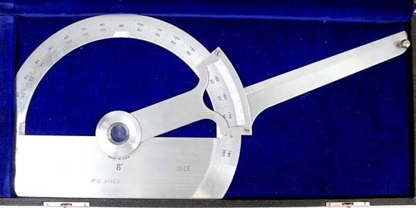8'' Engineer Drafting Vernier Compass Protractor, comes in original case marked U.S.C.E., by Union Instrument Corp. Plainfield N.J. Marked 8'' on the front, it has a small glass eye in the center with cross hairs, the outer scales go from 190-350 degrees in both directions & the inner scale goes from 30 -0-30 degrees the protractor arm measures approx. 10'' from pivot, the case is approx. 14.5'' x 6.75'' and is lined with blue fabric, monogrammed with previous owner's name