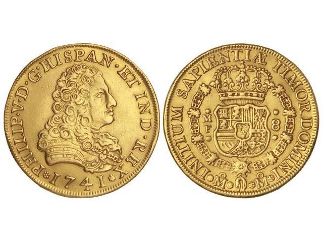 8 Escudos. 1741. FELIPE V. MÉXICO. M.F. Probablemente ha estado en aro. (Golpecito en canto. Limpiada (Cleaned). Cal-135; XC-437. (MBC+).