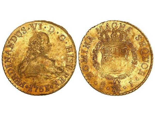 8 Escudos. 1751. SANTIAGO. J. Acuñación algo floja. (Rayas en anverso.). Cal-72; XC-644. EBC.