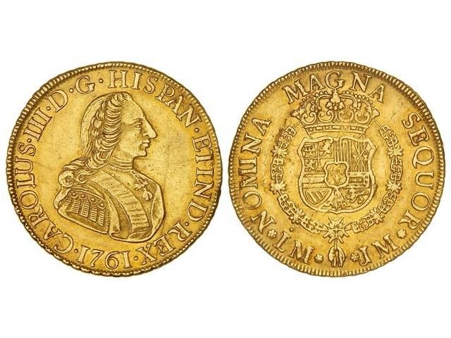 8 Escudos. 1761. LIMA. J.M. (Rayitas). RARA. Cal-9; XC-673. MBC+.