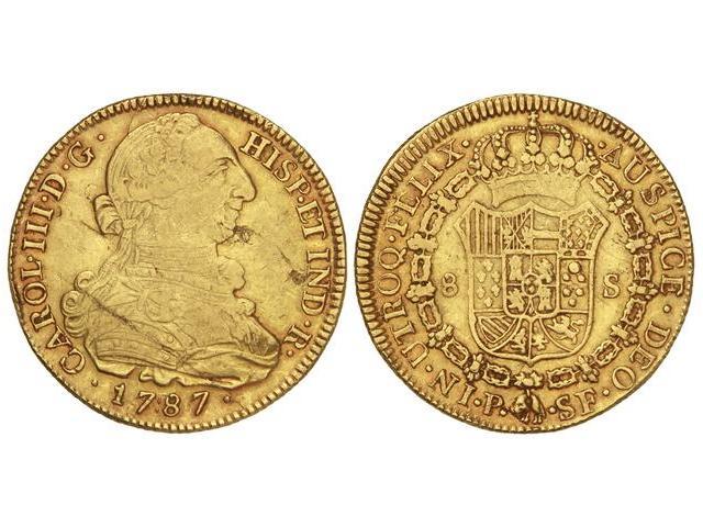 8 Escudos. - 1787. - POPAYÁN. - S.F. - (Hojas en anverso y golpecitos en canto). Cal-140. MBC-. - -