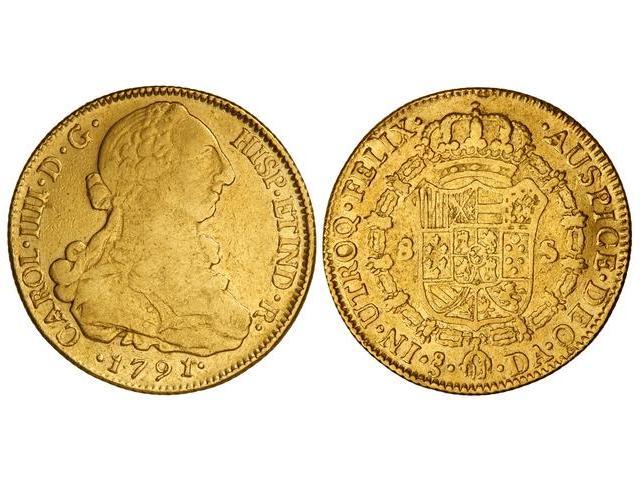 8 Escudos. 1791. SANTIAGO. D.A. Busto de Carlos III. Numeral IIII. (Ha estado en aro). Cal-150; XC-1155. BC+.