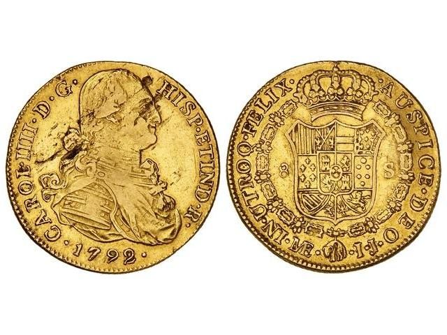 8 Escudos. 1792. LIMA. I.J. (Hojas saltadas en anverso. Limpiada). Cal-9; XC-982. MBC.