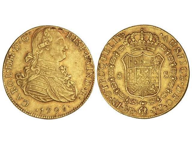 8 Escudos. - 1798. - LIMA. - I.J. - (Pequeñas hojitas en anverso). MUY ESCASA. Cal-16; XC-992. EBC-. - -