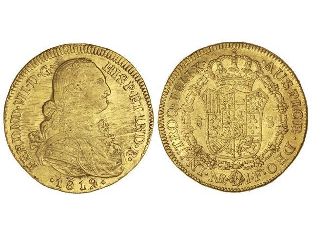 8 Escudos. - 1812. - NUEVO REINO. - J.F. - Busto de Carlos IV. Restos de brillo original. Metal poroso, normal en esta ceca. Cal-99; XC-1320. MBC+. - -
