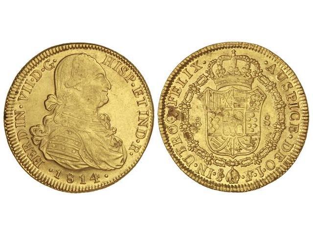 8 Escudos. - 1814. - SANTIAGO. - F.J. - (Rayitas y hojas en reverso, algunas saltadas). Cal-122. MBC/MBC-. - -