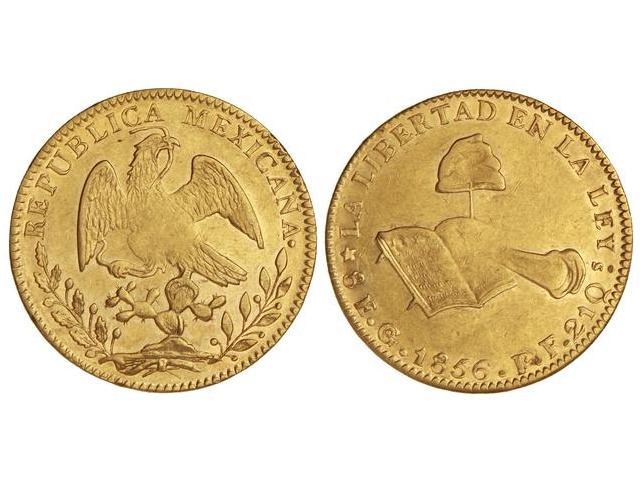 8 Escudos. 1856. GUANAJUATO. P.F. AU. Acuñación algo floja. Restos de brillo original. KM-383.7; XC-1965. (MBC+).