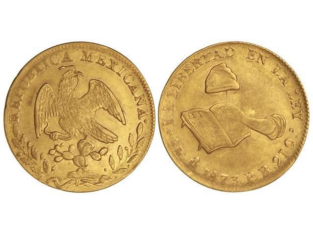 8 Escudos. 1873. HERMOSILLO. P.R. AU. Acuñación algo floja, normal en éstas piezas. MUY ESCASA. KM-383.8; XC-1993. MBC+.