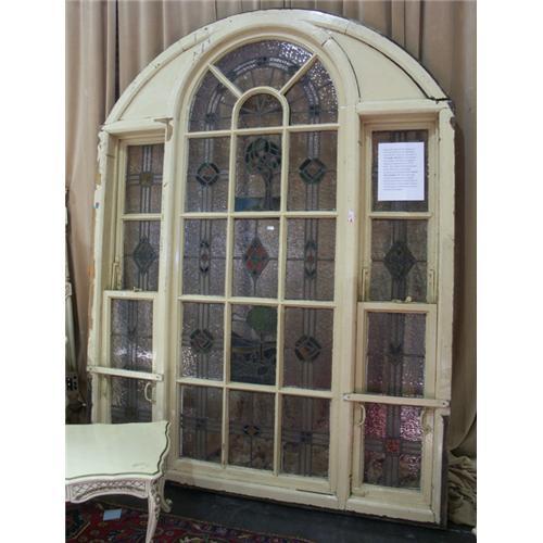 STAINED GLASS/ARCHITECTURAL REMNANT: Large scale stained glass window including several sliding smaller windows within the frame, woodwork painted beige. Approx. 74'' x 96''
