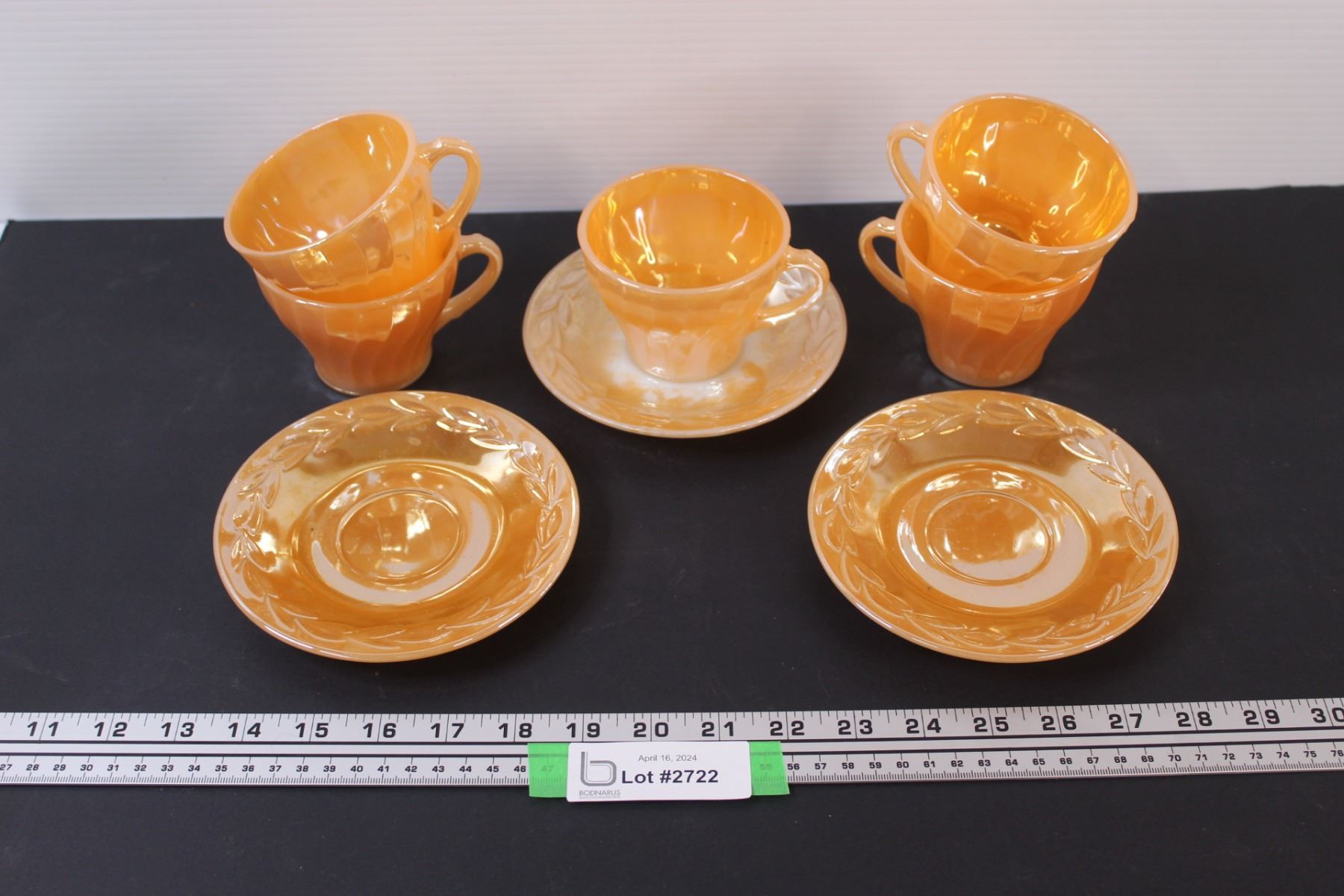 (8) Fire King Peach Lustre - 5 Tea Cups Swirl Pattern and 3 Tea Saucers Leaf Pattern