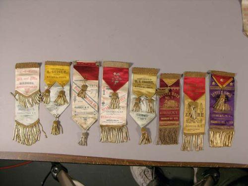 8 fireman's ribbons - Hornellsville/Syracuse 1885/Waverly,NY 1881/Waverly 1884/Utica 1884/Auburn 1879/Rochester 1882/Auburn 1879. Ex. cond.