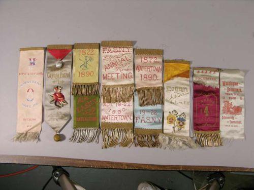 8 fireman's ribbons - Utica 1884/Auburn/Watertown 1890/Watertown 1890/Auburn/Rochester 1882/Troy 1881/Burden Lake 1896/Oneonta 1891. Ex. cond.