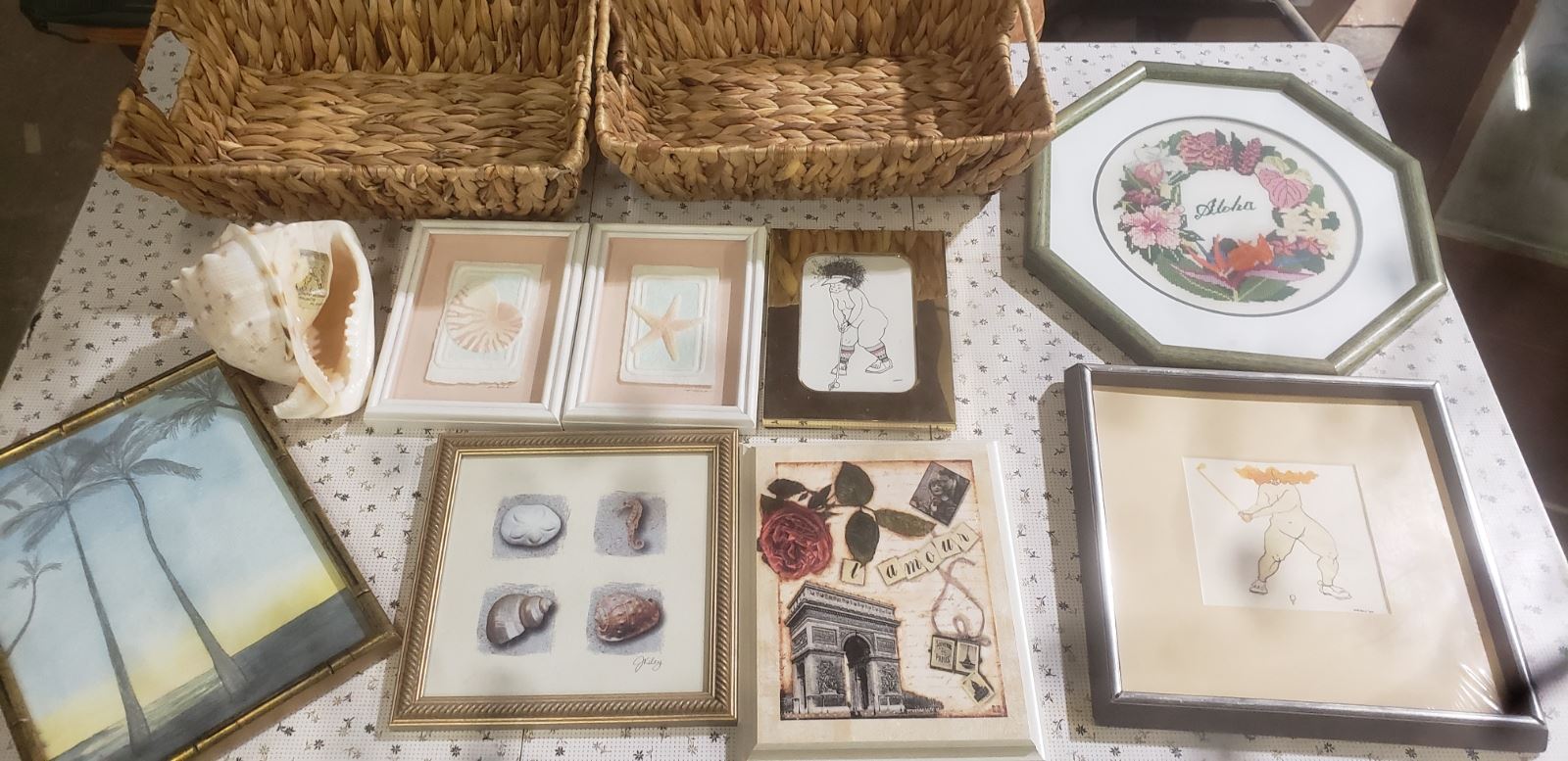 8 Framed Pictures Largest 13'' x 13'' , 2 Baskets , Sea Shell