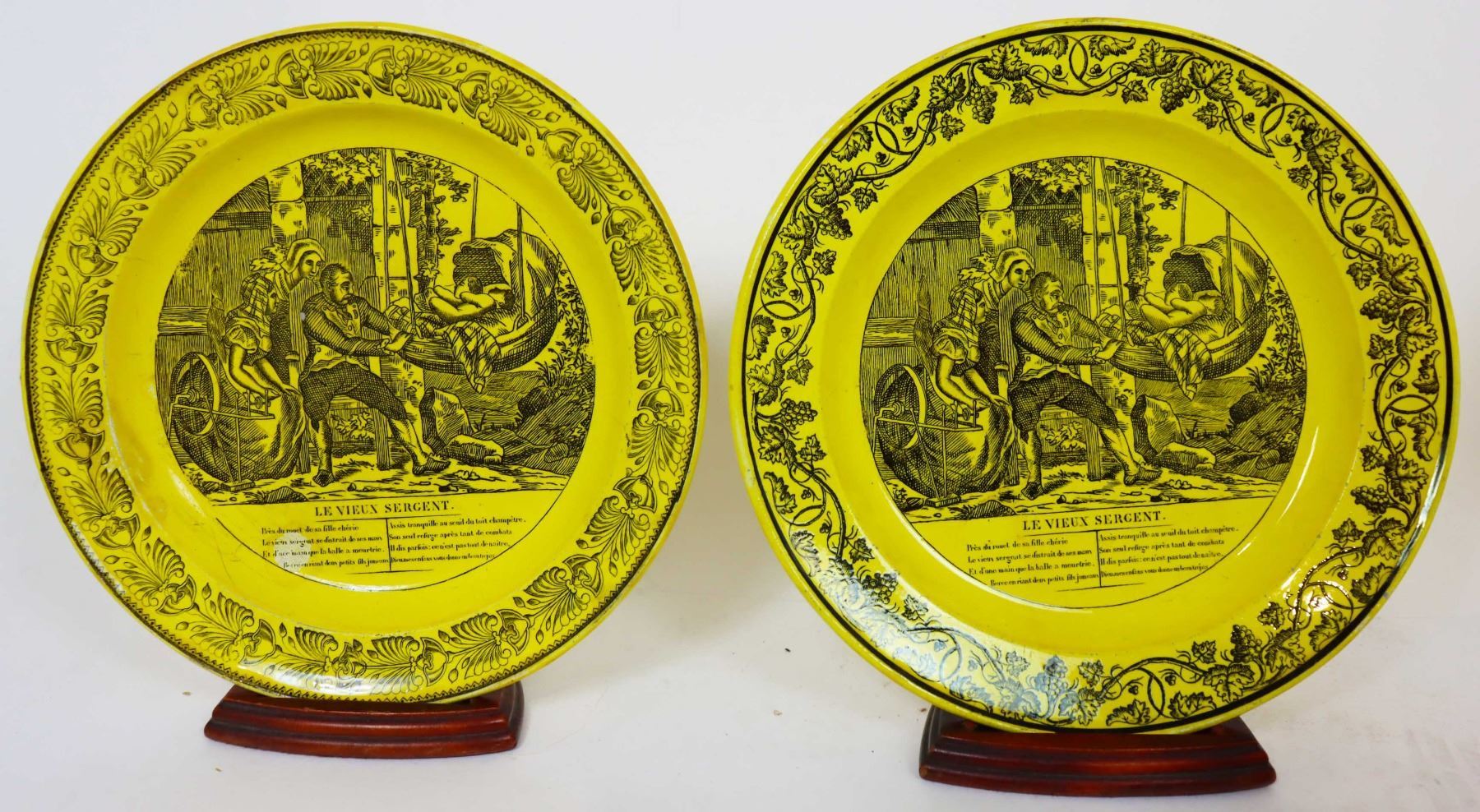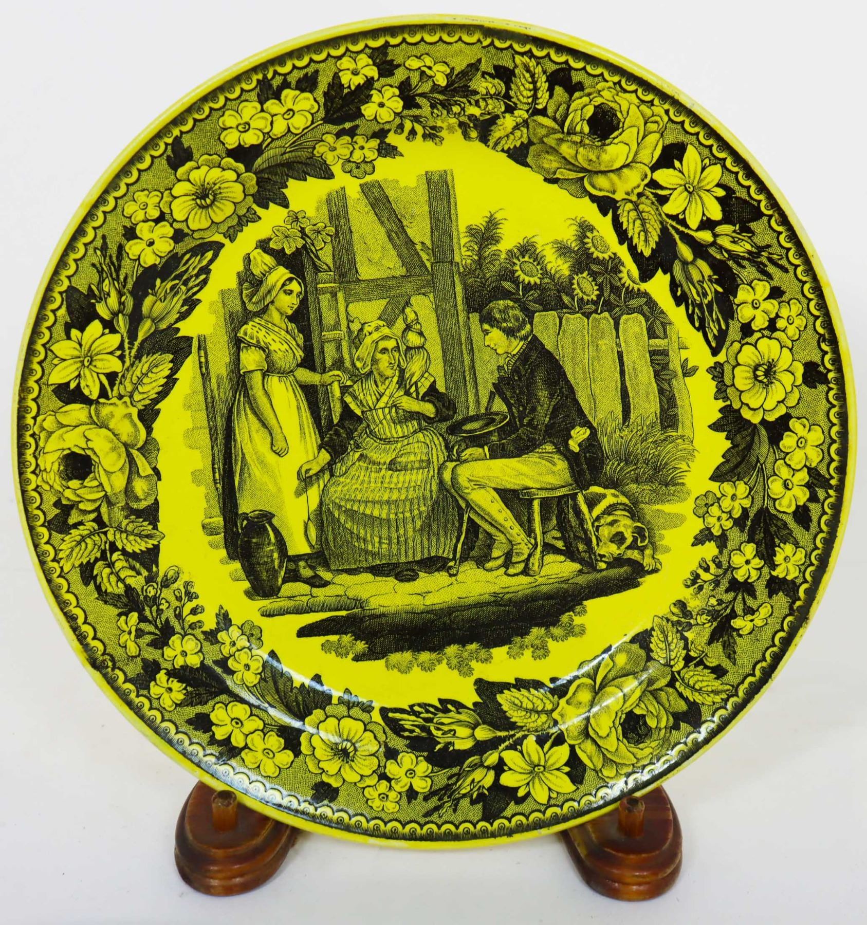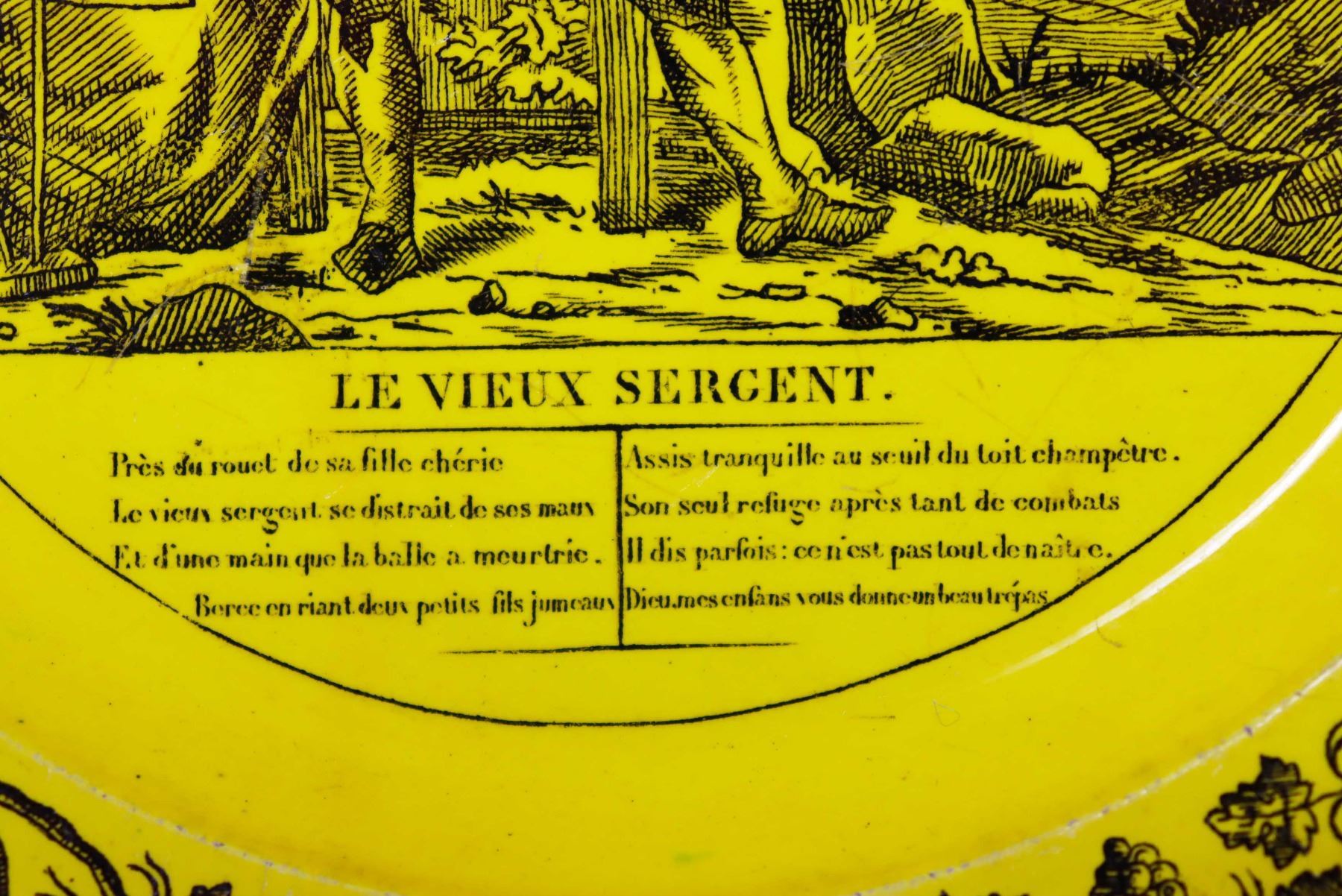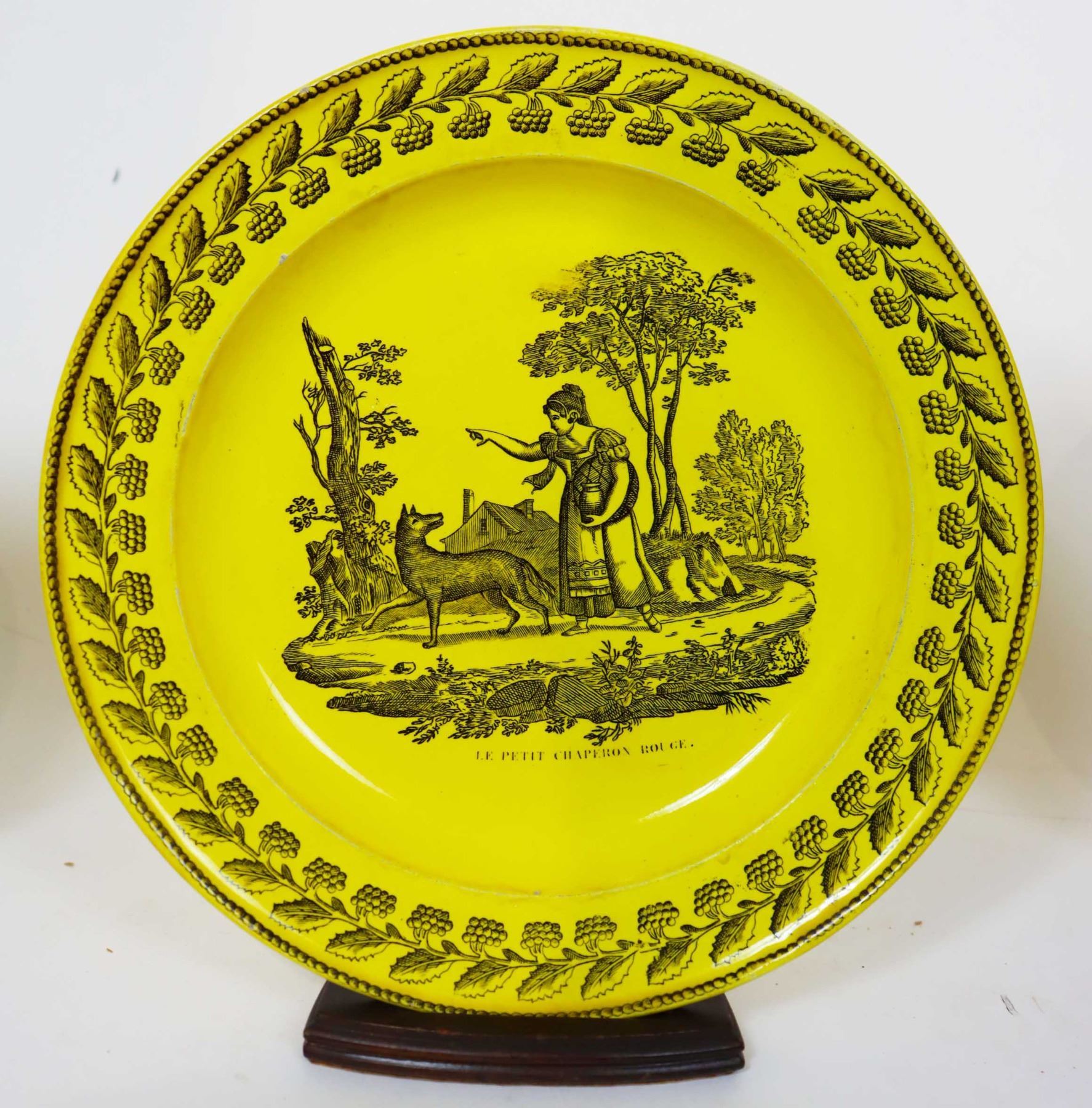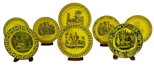 Eight piece French Creil Porcelain set in canary yellow. Eight pictoral plates in total.