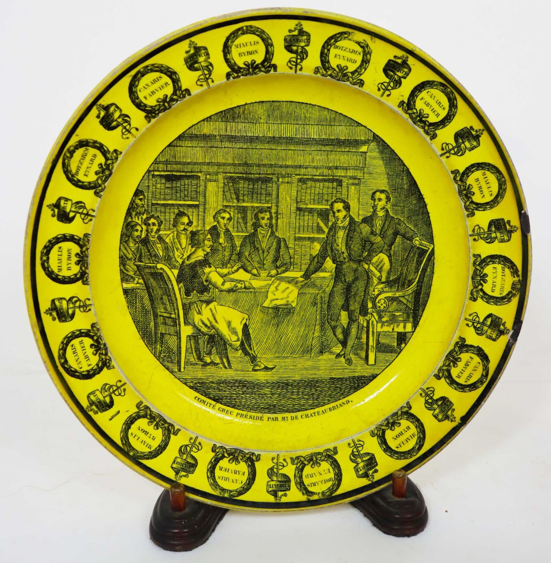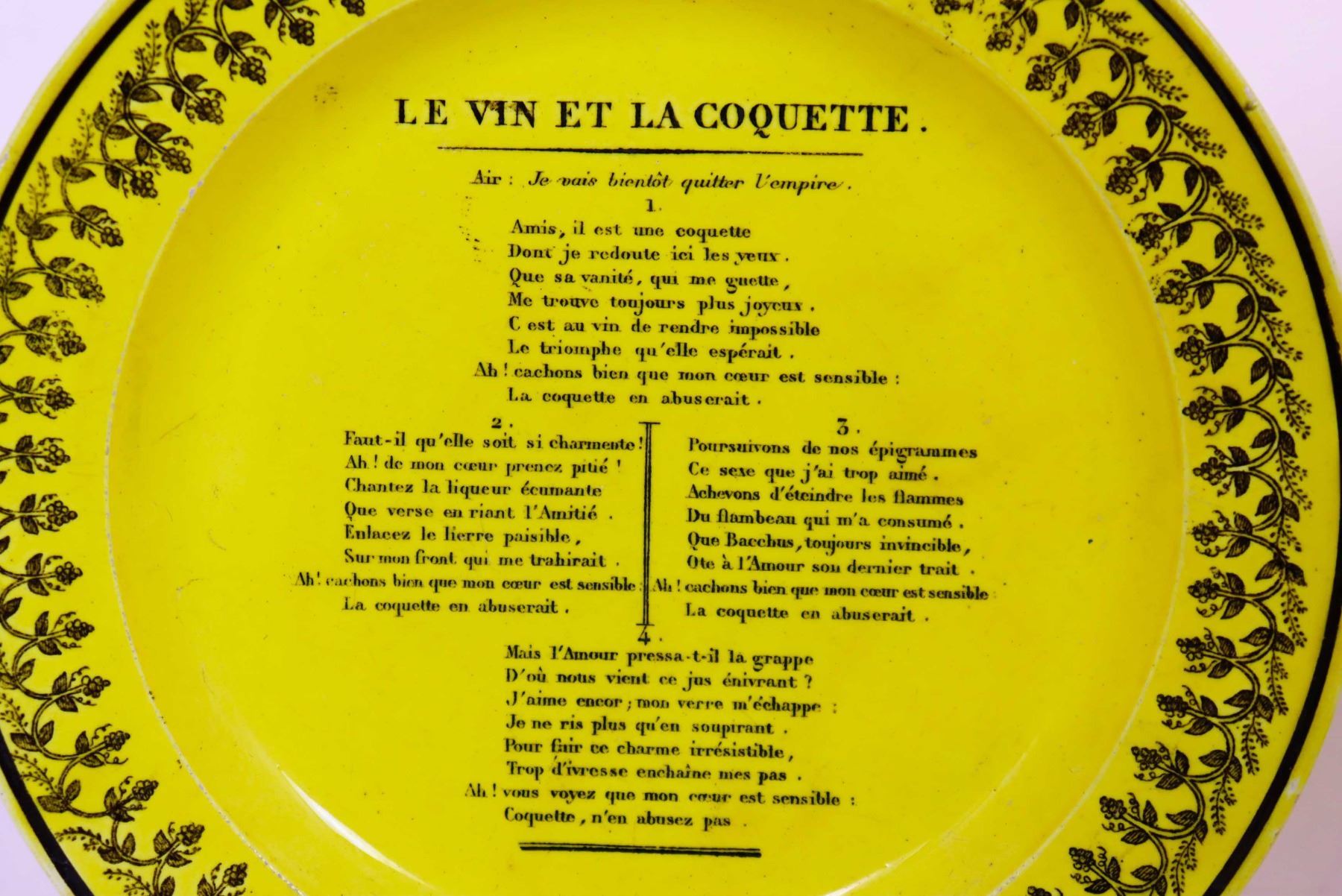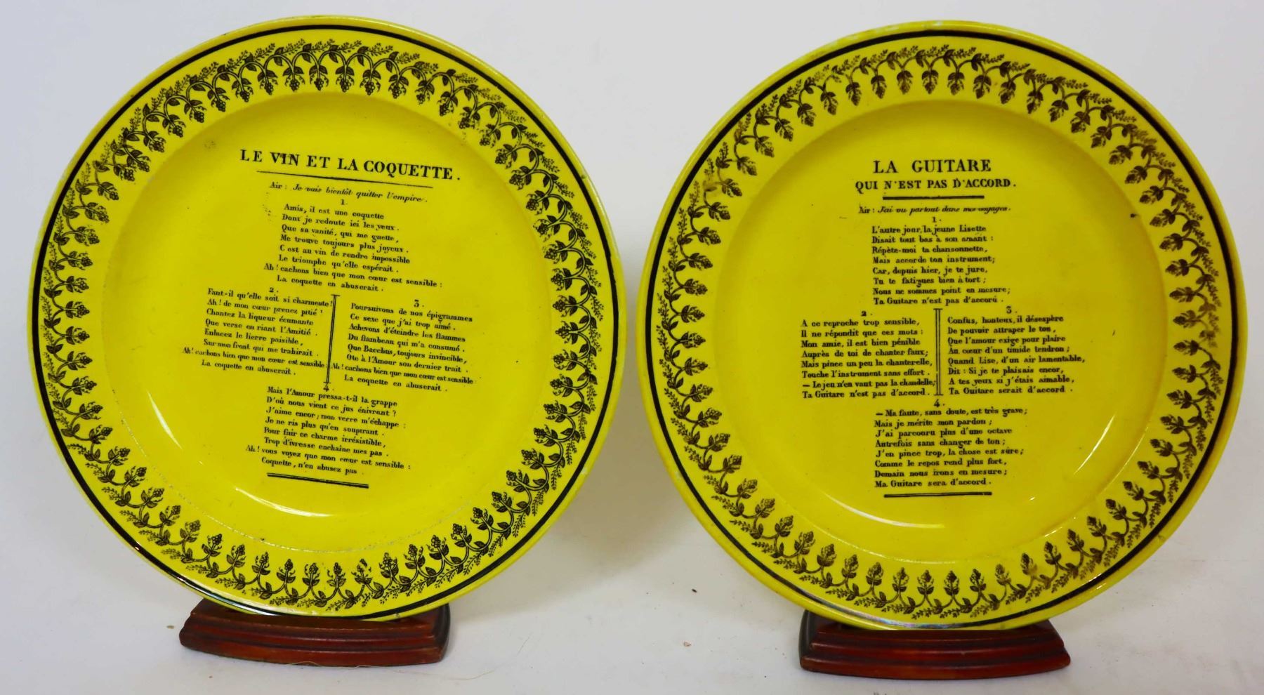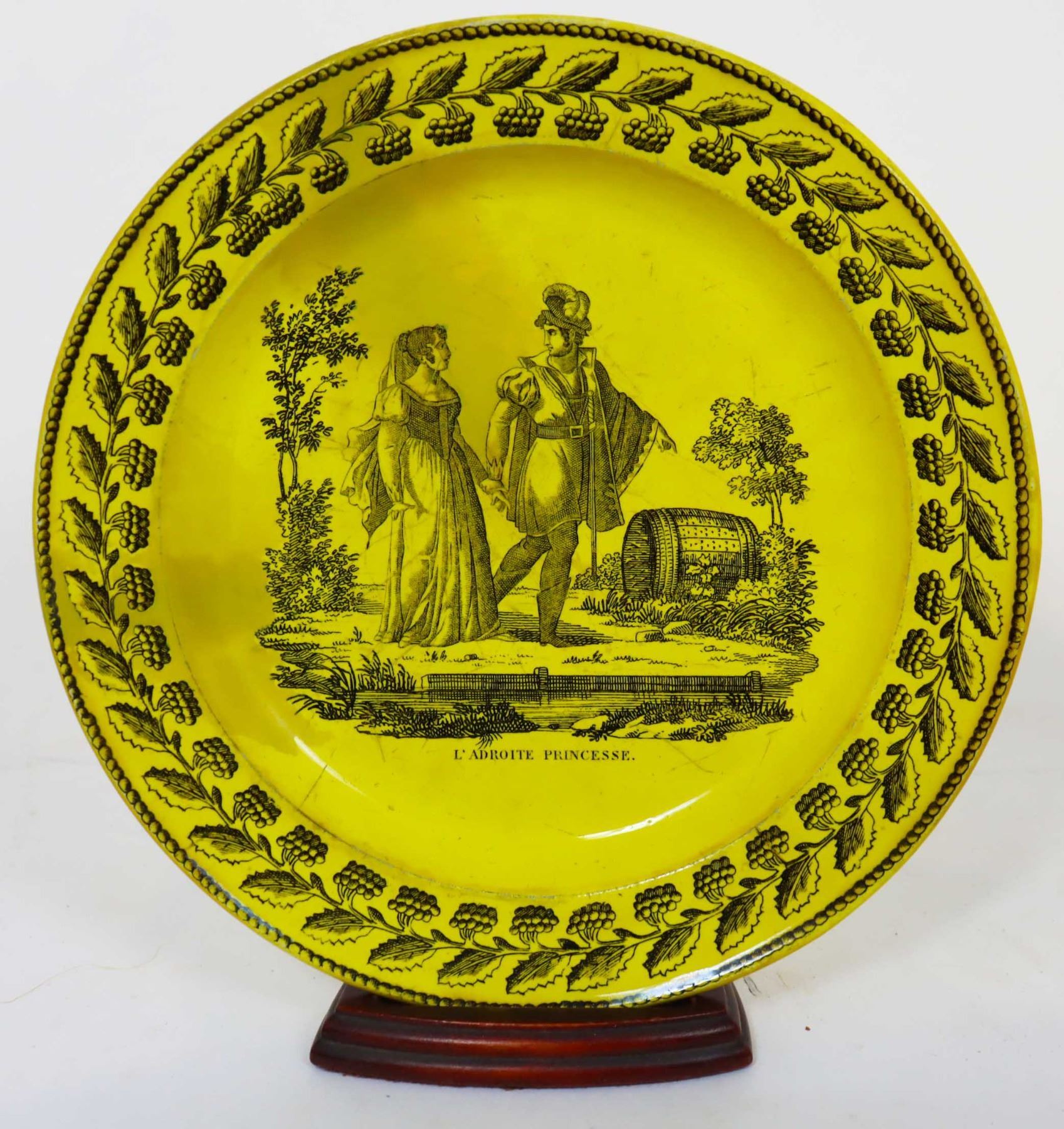 Eight piece French Creil Porcelain set in canary yellow. Eight pictoral plates in total.