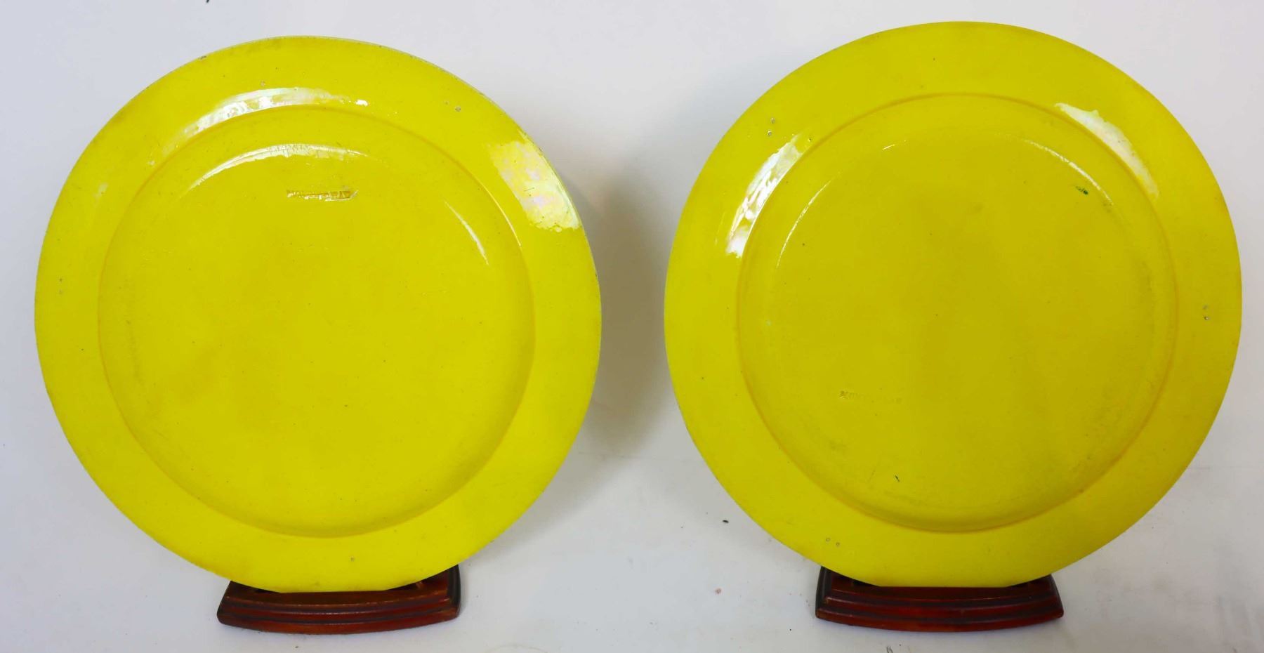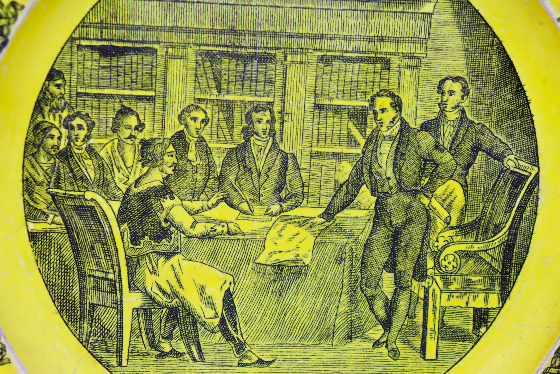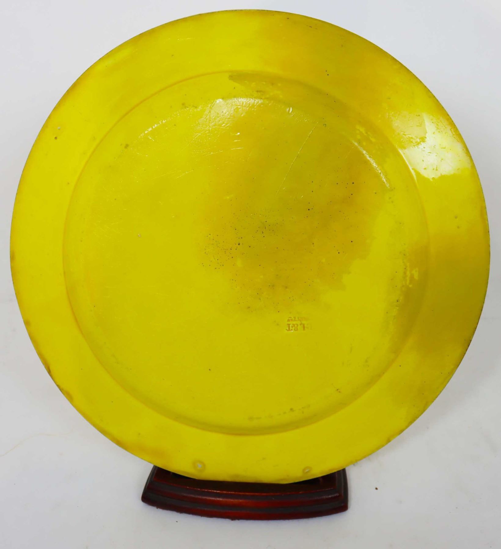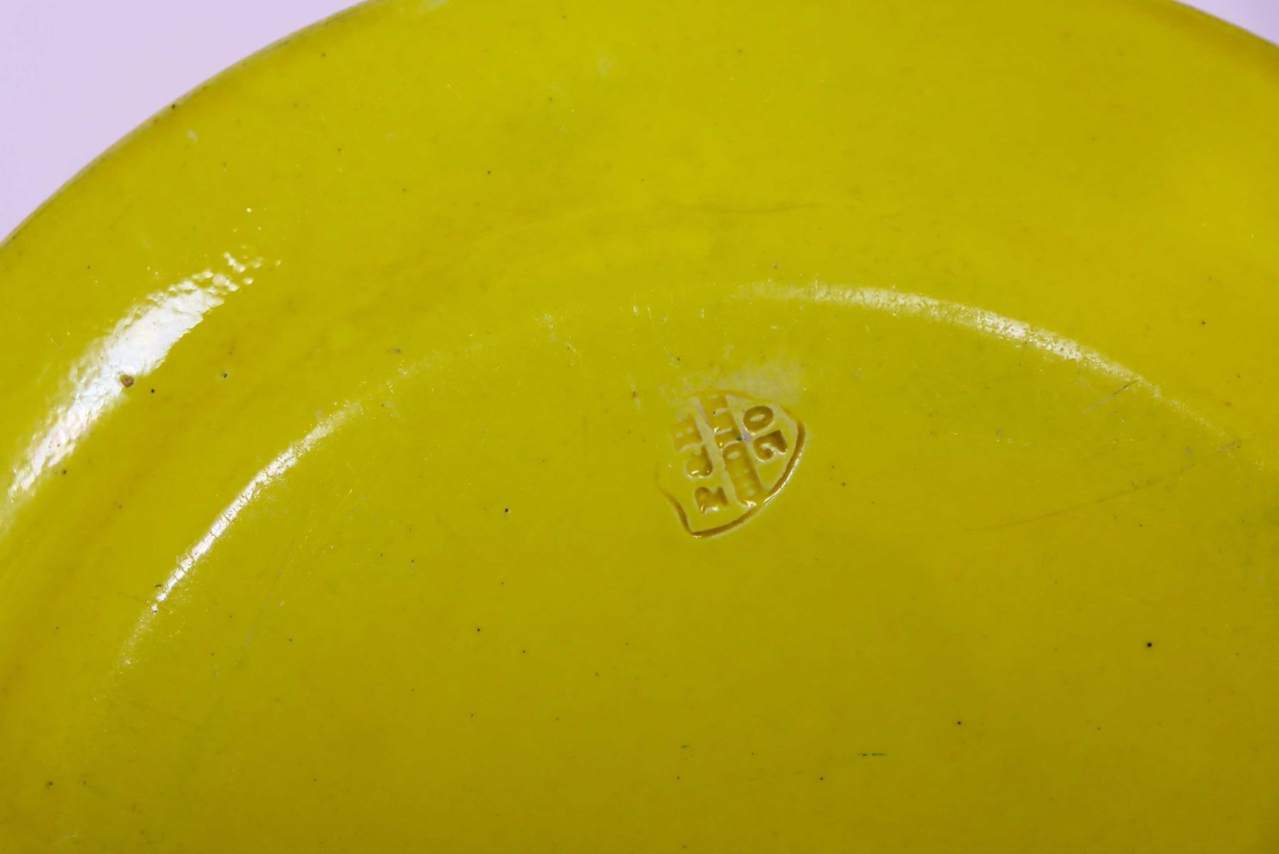 Eight piece French Creil Porcelain set in canary yellow. Eight pictoral plates in total.