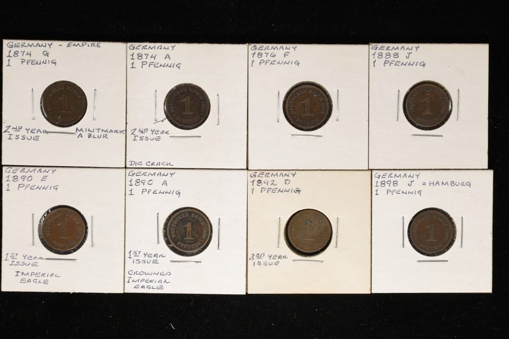 8-GERMAN 1 PFENNIG COINS: 1874-G, 74-A, 76-F, 88-J