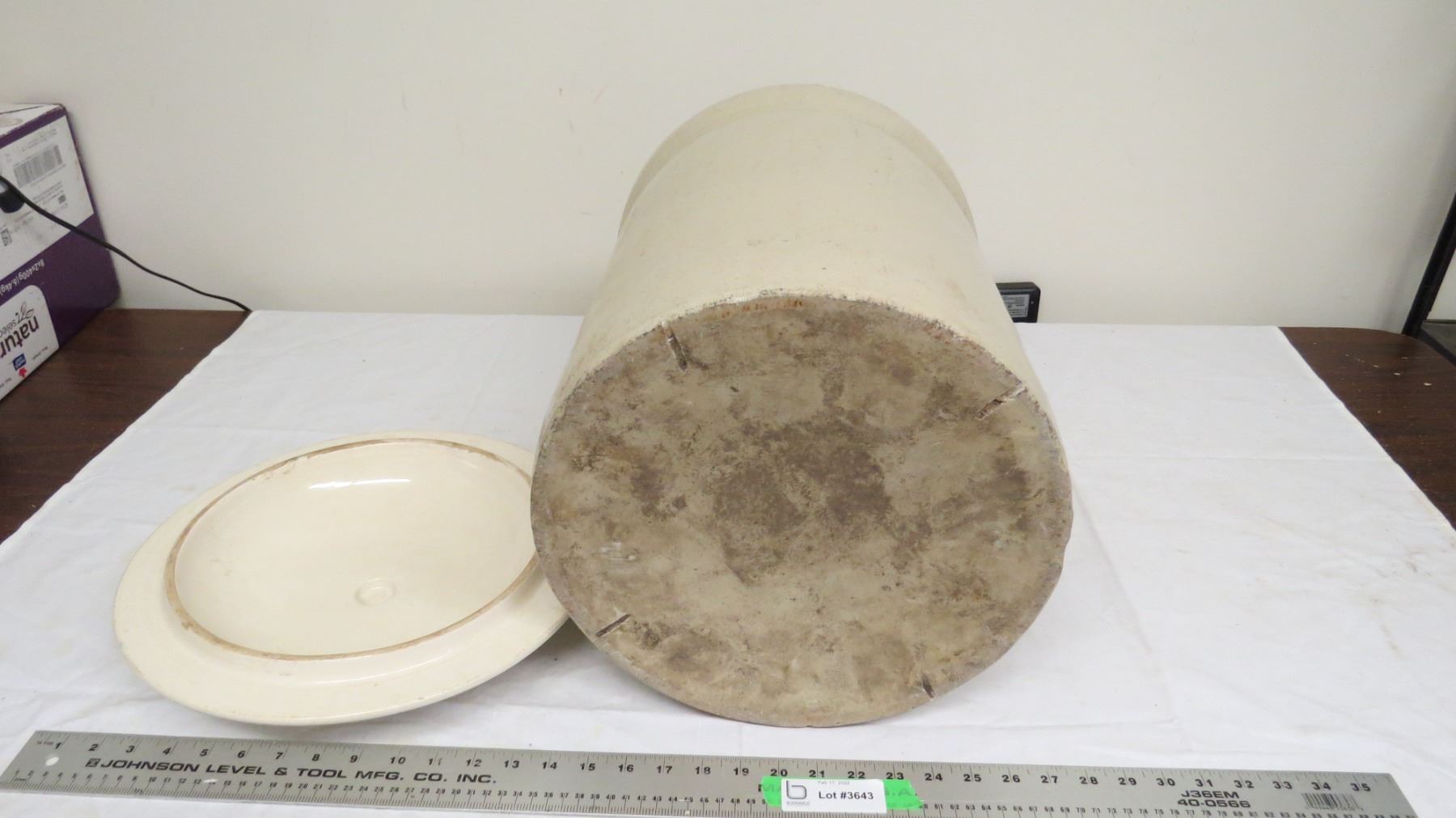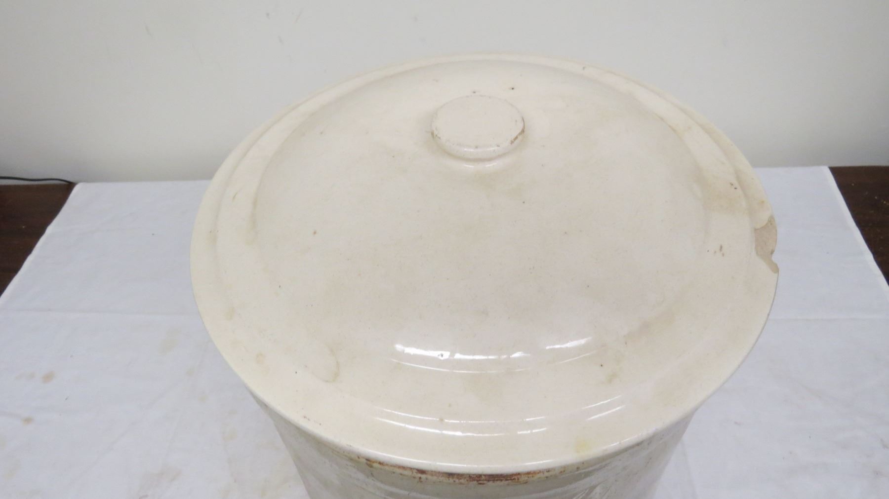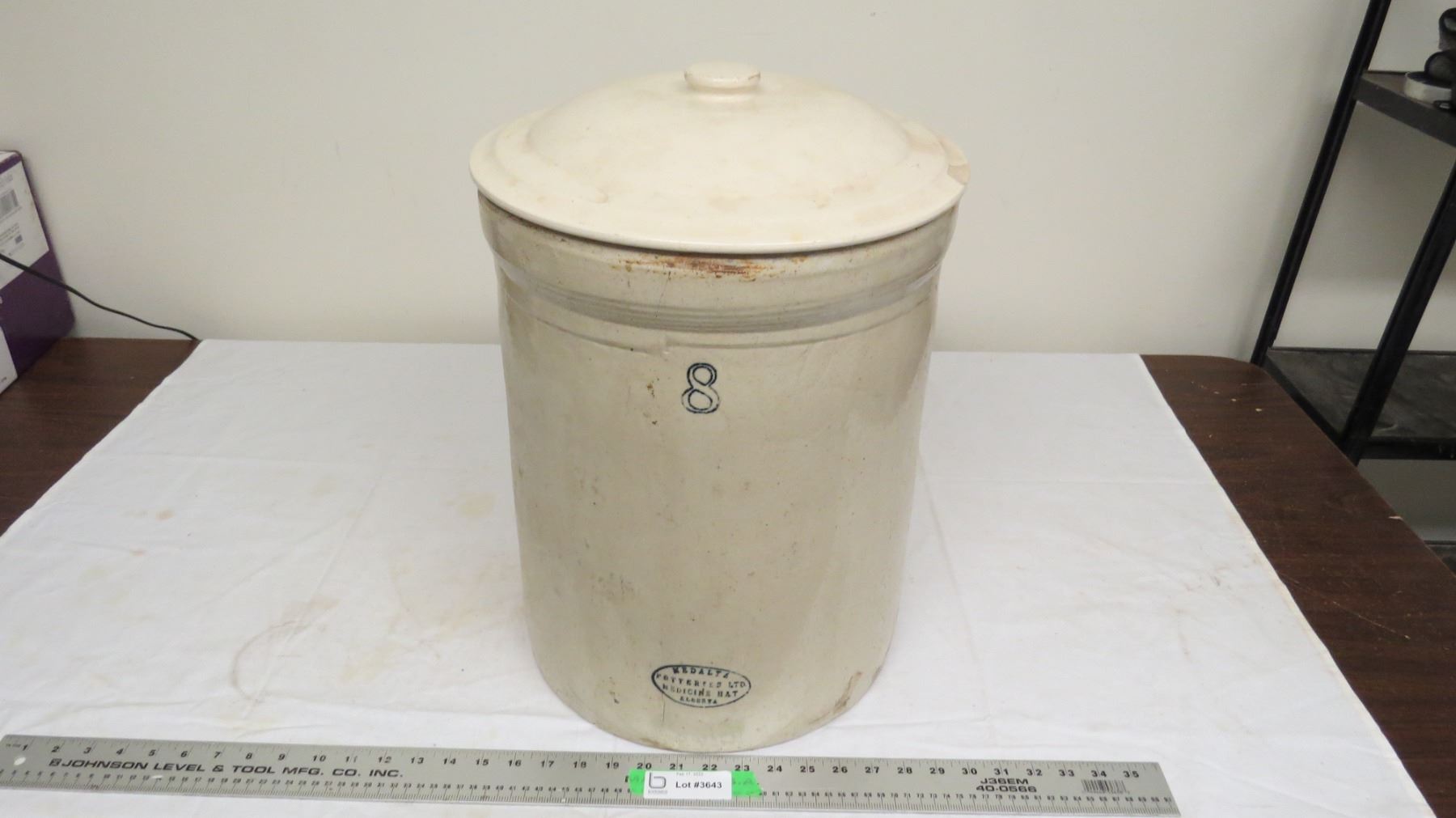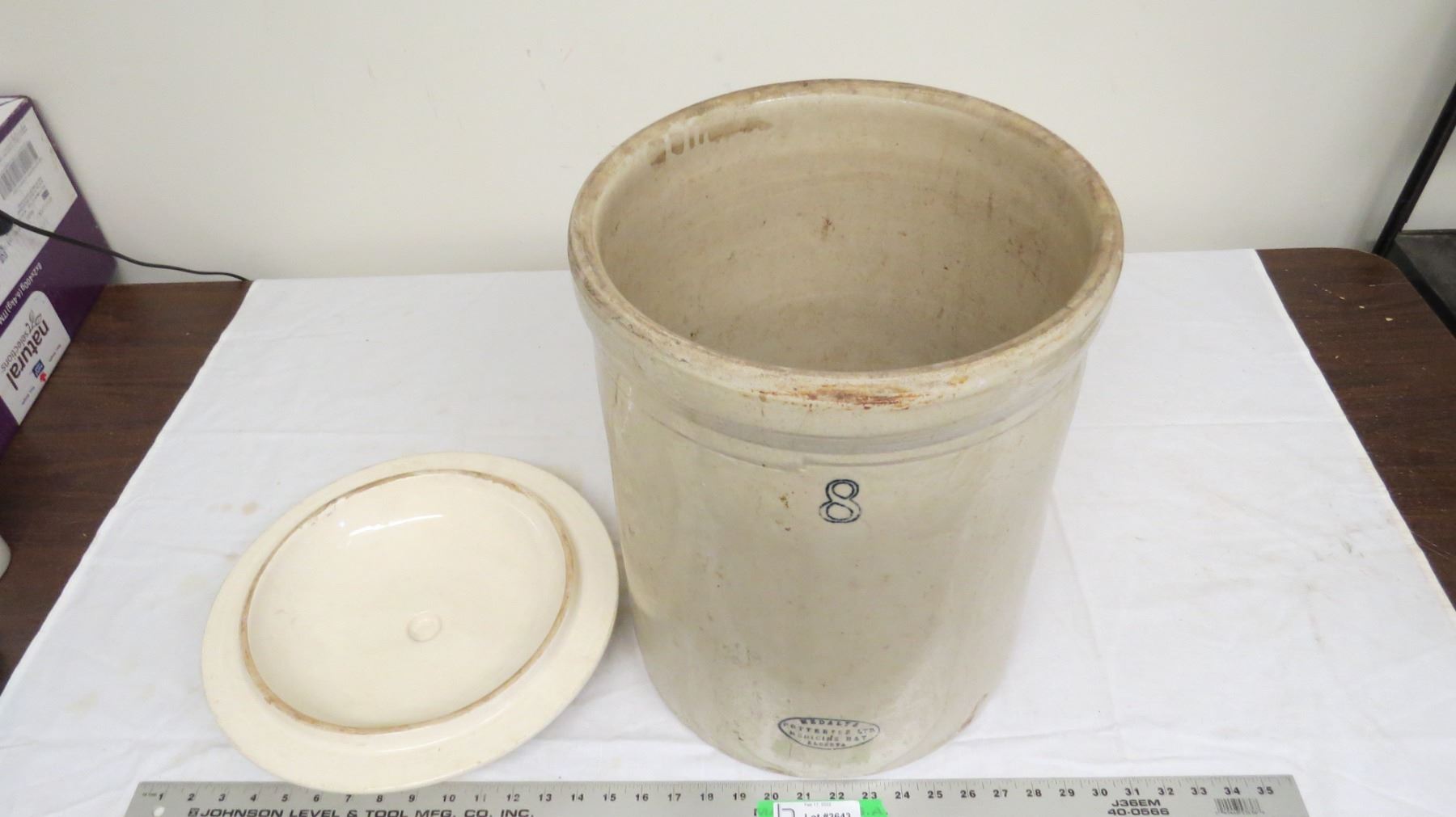 8 Gal Medalta Potteries stoneware crock with lid - lid has chip