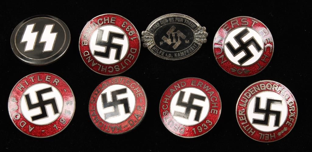 This grouping includes: SS; National Sozalistishe DAP; 2 Deutschland Erwache 1933/ Heil Hitler Ludendorff v Grafe; SS FM; Nun Erst Recht; Adolf Hitler 1933. They measure 1" in diameter. They are 'RZM' maker marked. All have a thin horizontal pin back. Nickel construction with enamel.