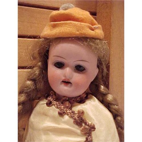 This little # 120 Goebel is in very nice condition. She has what appears to be her original wig. The clothing is homemade. A doll collector told me these Goebel dolls were sold as kits with naked dolls and patterns for a child to learn sewing. I have another on goantiques that appears to have a homemade out fit too so this is probably true. Both outfits and dolls are very nice. This doll has dark blue sleep eyes and nice even painting. The body is very good too. There are no repairs or damage that I can detect. Clothing is fairly clean. She is the perfect cabinet size and reasonably priced.