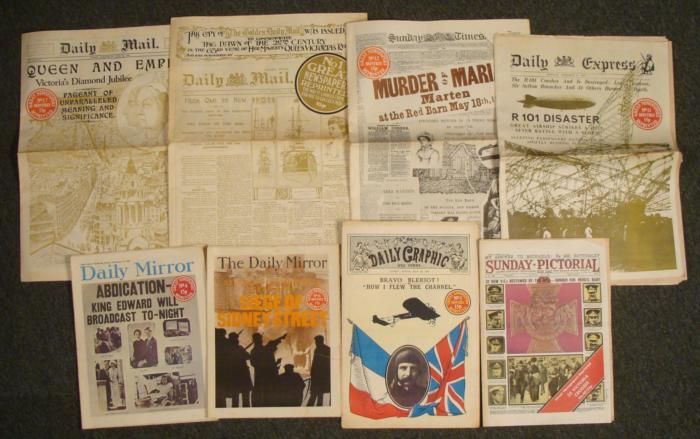 These 8 newspaper reprints are from the Great Newspapers series. All are British papers highlighting historic events. * Included are:Sunday Times 1828 (Murder of Maria Marten)Sunday Pictorial 1917 (V.C. heroes honored by King)Dailyu Graphic (Bleriot first cross Channel flight)Daily Express 1930 (R 101 zeppelin disaster)Daily Mirror 1911 (anarchist burglars)Daily Mirror 1936 (King Edward)Daily Mail 1897 (Queen Victoria's Diamond Jubilee)Daily Mail Golden Exttra (dawn of the 20th century) * They are in very good condition, with light folds and wear, and a few light tears inside. * These are great complete papers for historical interest, history classes, or just some terrific reading.