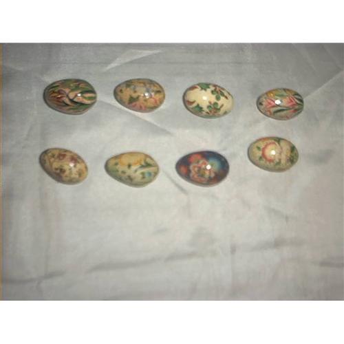 8 Hand Painted Wooden Eggs. Very nicely hand painted wooden eggs, all with different designs painted on them. All different flower designs and they look simply great. I don't see any marking on them, but don't know where to look either. They are all wooden eggs and all hand painted and very colorful items, and great add to any collection you may have. Hope you enjoy them. If you know what they are called, please e-mail us so we can put it up in the ad copy. I have never seen such beautiful Hand Painted ones, without any marking. Hope you like them.