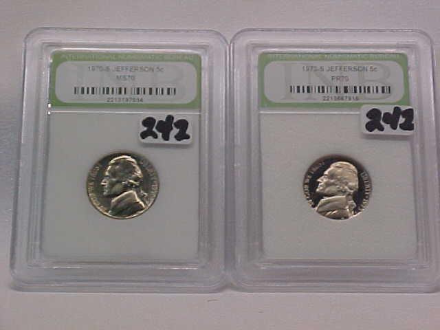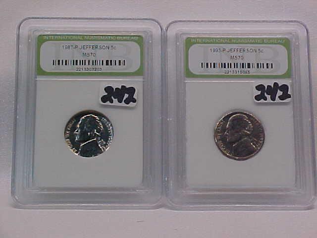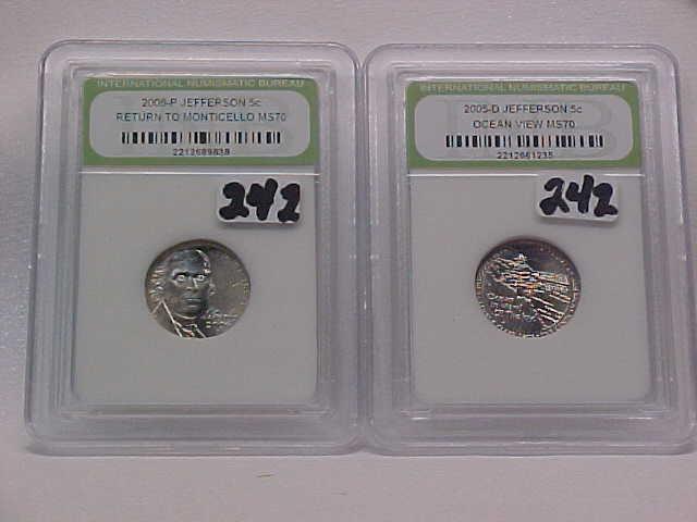 8 INB Jefferson Nickels (not sealed): 6-MS70, 1 PF70 (70S, 73S PF, 87, 93, 04D Boat, 05D Bison, 05D Ocean, 06 Monticello)