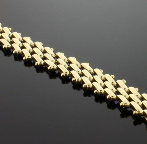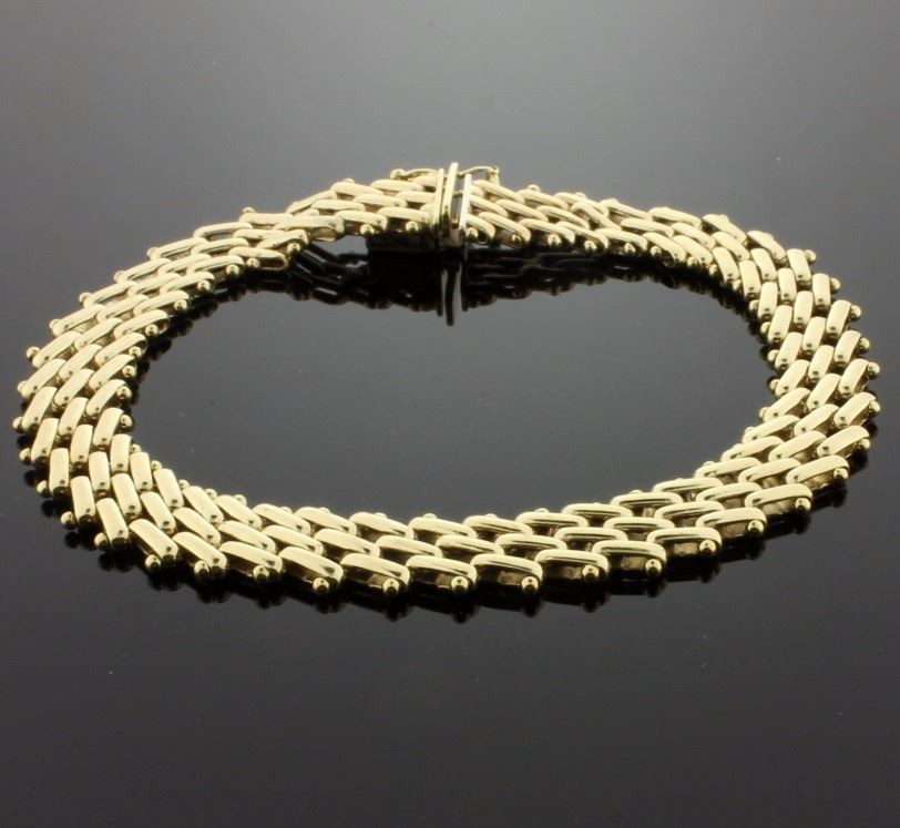 14K yellow gold, it is 9.4mm wide and has a safety clasp. 20.9g