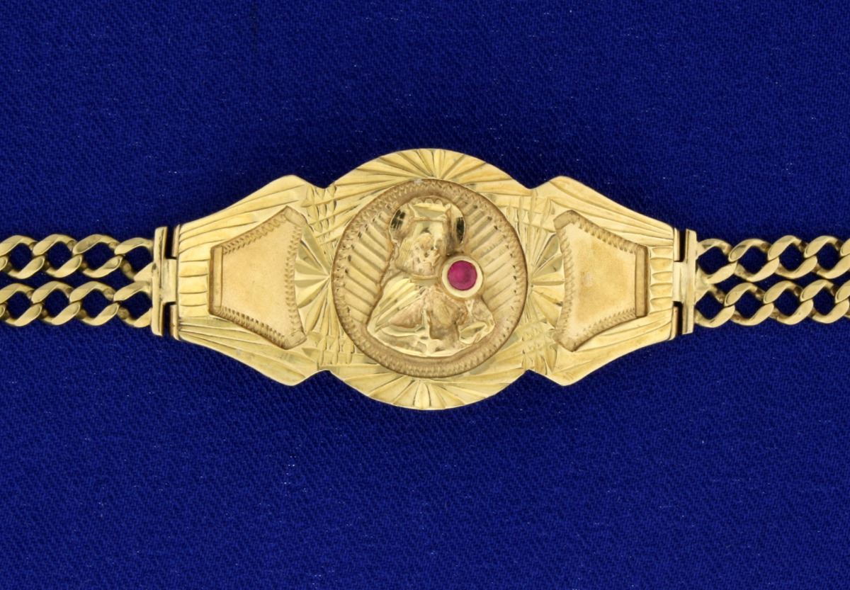 In 14k yellow gold, containing a 3mm Ruby. 19.6g.