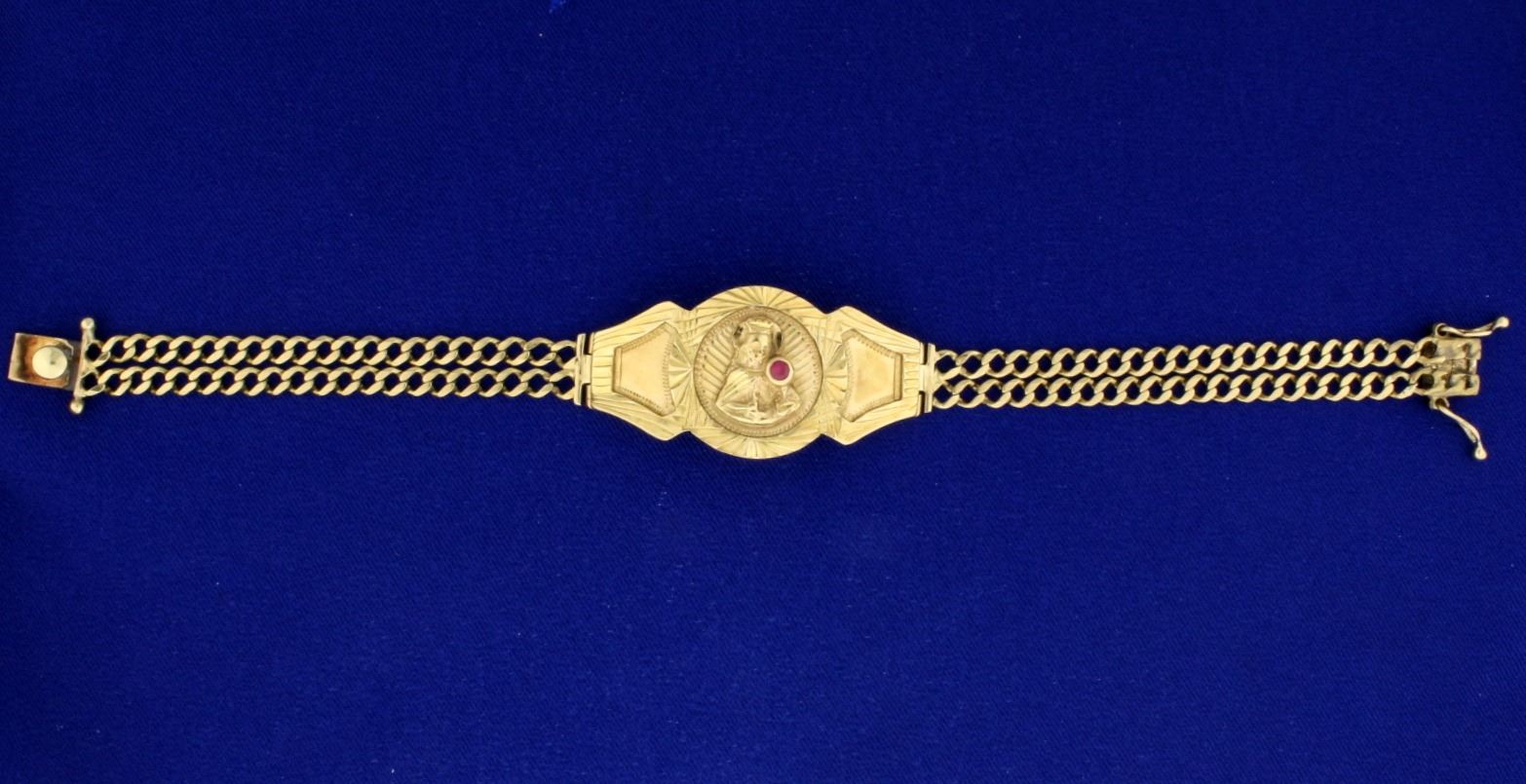 In 14k yellow gold, containing a 3mm Ruby. 19.6g.