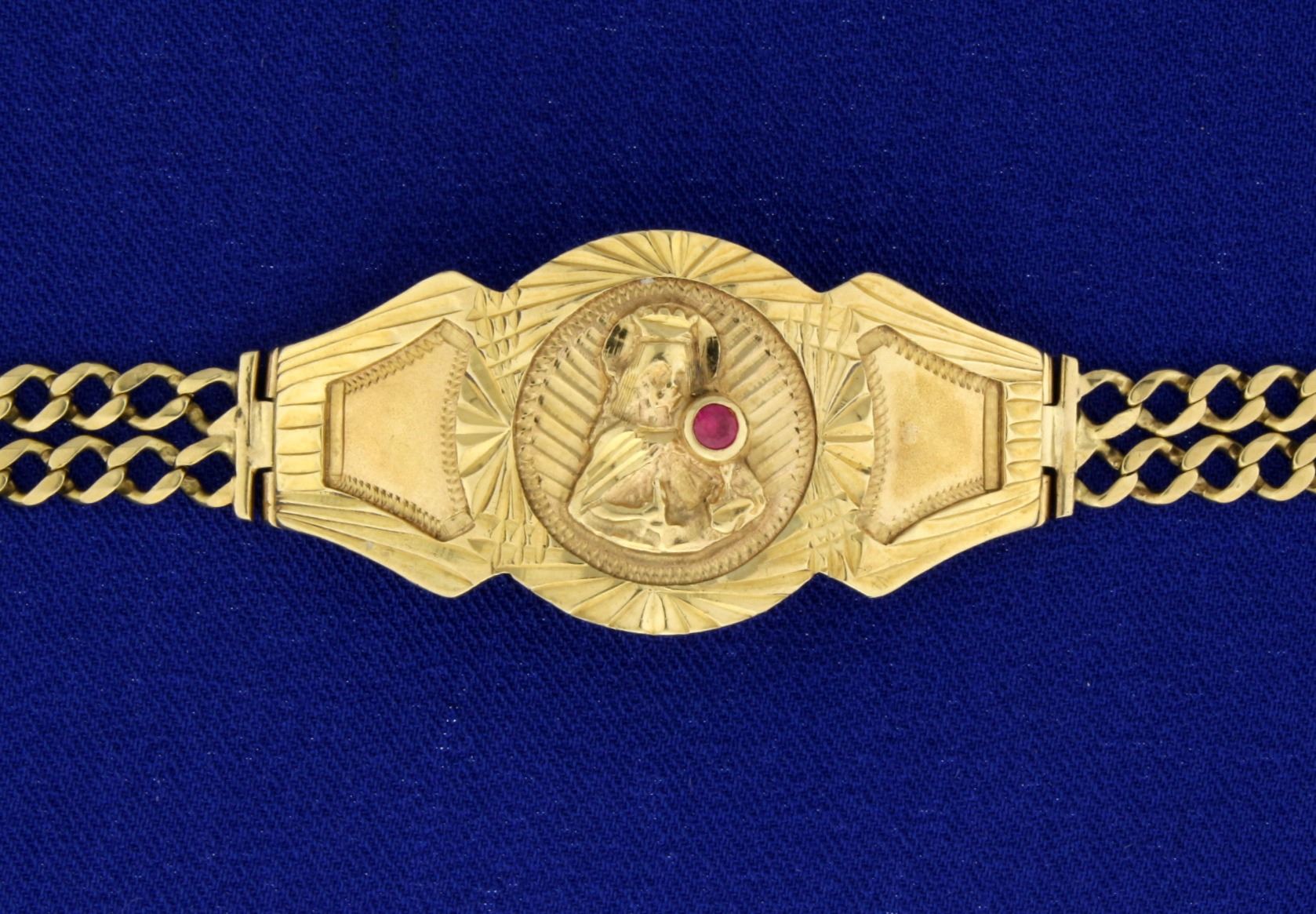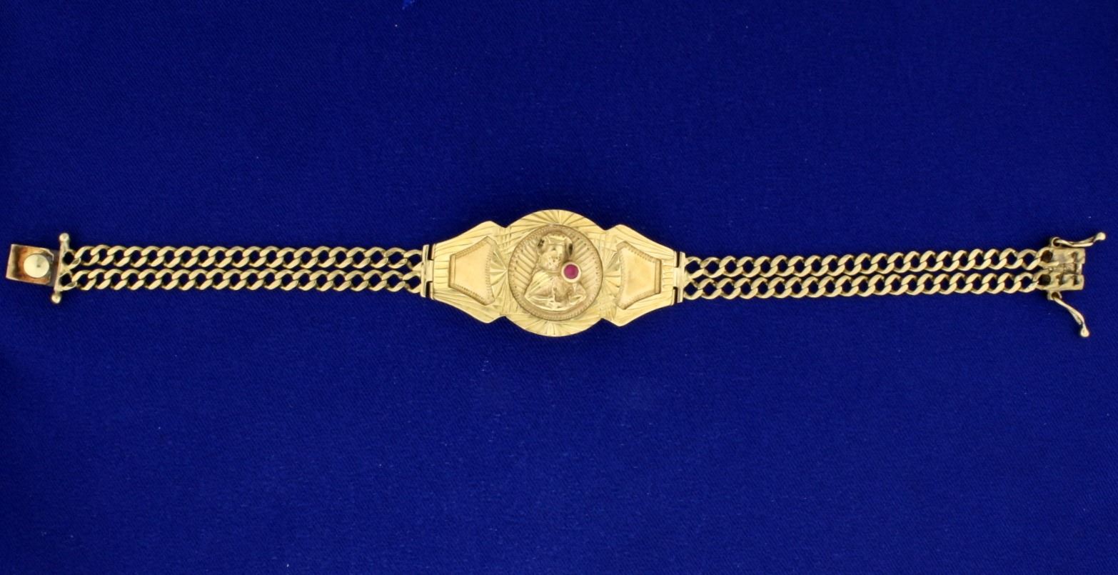 In 10k yellow gold, containing a high quality 3mm natural Ruby. 19.6g.