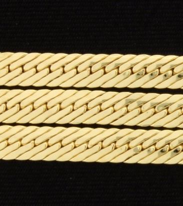 In 18K yellow gold, this bracelet is 8 inches long with 3 herringbone chains attached at each side of bracelet. Each one is 3mm thick. 10.6g