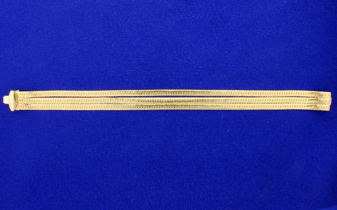 In 18K yellow gold, this bracelet is 8 inches long with 3 herringbone chains attached at each side of bracelet. Each one is 3mm thick. 10.6g