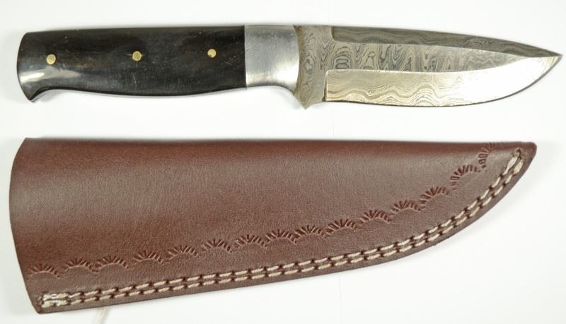 8 Inch Ladder Pattern Genuine Top Grade Damascus Steel Hunting Knife/Skinner with a Black Bull Horn Handle. 4" blade, 4" handle, genuine Leather Sheath. EST:$150-$200