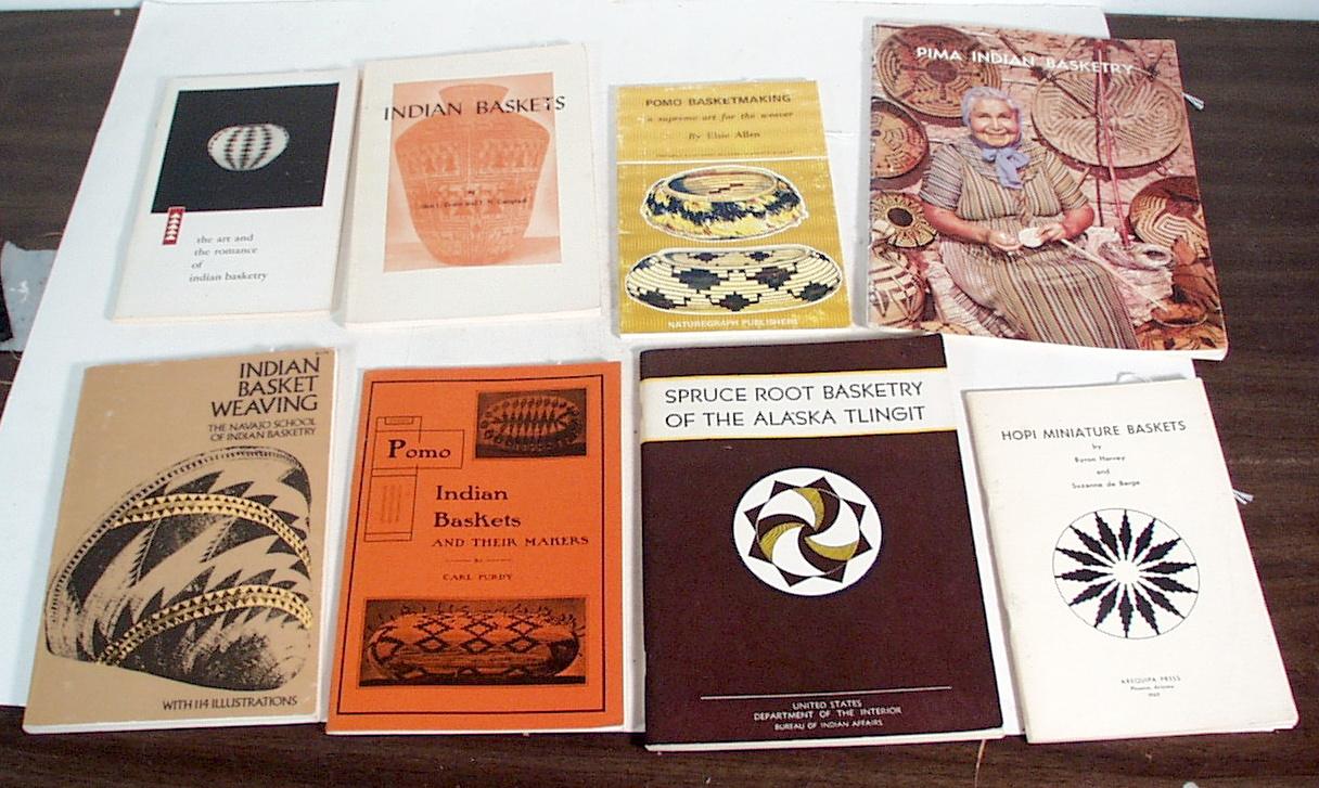 8 books about Indian basketry. 1) Indian Basket Weaving; The Navajo School of Indian Basketry with 114 illustrations. 103 pages. copyright 1903, 1971. 6" x 9". Good condition, some cover rubbing. The methods of Indian basket weaving explained in this excellent manual are the very ones employed by native practitioners of the craft. 2) Pomo Indian Baskets and their makers by Carl Purdy. Softcover. 44 pages. 6" x 9". Very good condition. 3) Spruce Root Basketry of the Alaska Tlingit. Softcover. 80 pages. 1944, 1951. Very good condition. 7" x 9-1/2" 4) Hopi Miniature Baskets by Byron Harvey and Suzanne de Berge. 1969. Softcover. 42 pages. 5-1/2" x 8-1/2". Very good condition. 5) The Art and Romance of Indian Basketry. Softcover. 1957. Good condition. 5-1/2" x 8-1/4". Clark Field collection. 6) Indian Baskets by Glen L. Evans and T. N. Campbell. Softcover. 72 pages. 1952. Very good condition. 6" x 9". Many black and white and color photos. 7) Pomo Basketmaking; a supreme art for the weaver by Elsie Allen. Softcover. 68 pages. 1972. Good condition.