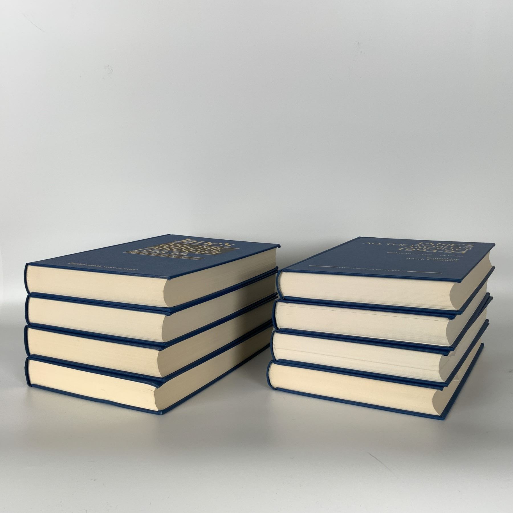 This lot features a collection of eight volumes from the esteemed Jane's All the World's Aircraft series, covering the years 1993-94, 1995-96, 1996-97, 1997-98, 1998-99, 1999-2000, 2000-2001, and 2001-2002. Known for its comprehensive and authoritative coverage of global aviation, these hardcover reference books provide detailed specifications, technical drawings, and insights into both military and civilian aircraft of their respective years. Edited by experts in the field, Jane's publications have long been the standard resource for aviation professionals, historians, and collectors. Each volume is bound in blue cloth with gilt lettering, displaying only minor signs of handling. This is an excellent set for researchers, enthusiasts, or those seeking an in-depth historical perspective on aircraft development through the late 20th century.
