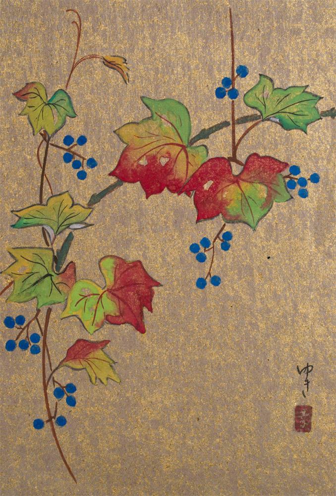 One Hiroshige cursor date 190-1942 view of figures in the rain. Some toning and fading but with no tears. The second print by Utamako 1754-1806 facing right. No tears mild toning and fading. The third depicts second Utamako facing left and down Geisha with scroll. Very good condition with little fading and strong colors. The next shows two Hakunobu style woodblocks on pager, no censor seals late 19th early 20th century. The next is two Fuji mums, floral and poppies on texture background. Condition is good, no tears. Next is a brilliant woodblock signed yet unidentified red and green leaves with blue berries on a ground of gold leaf paper. Circa late 20th century