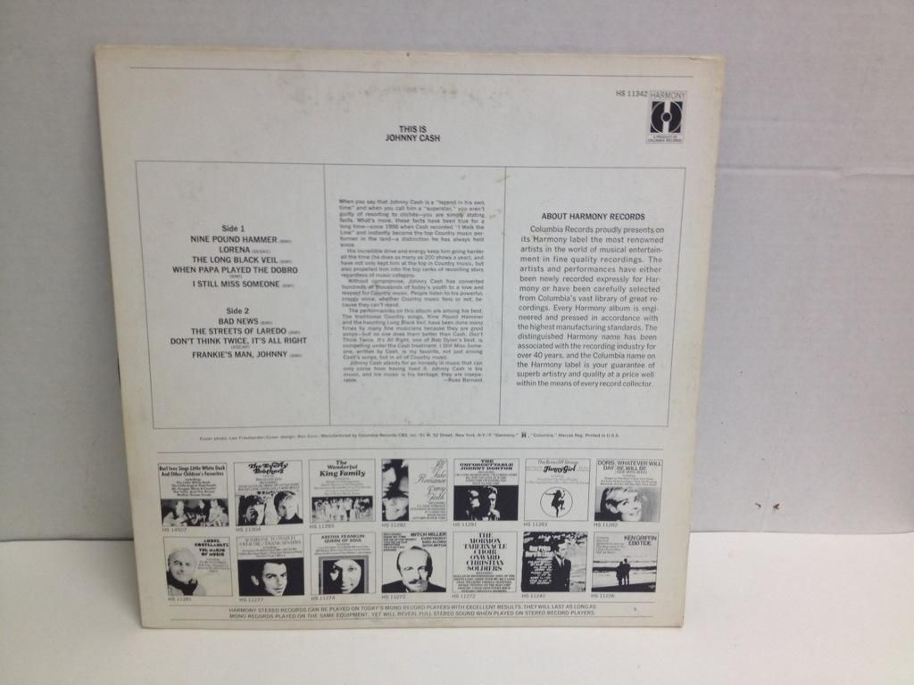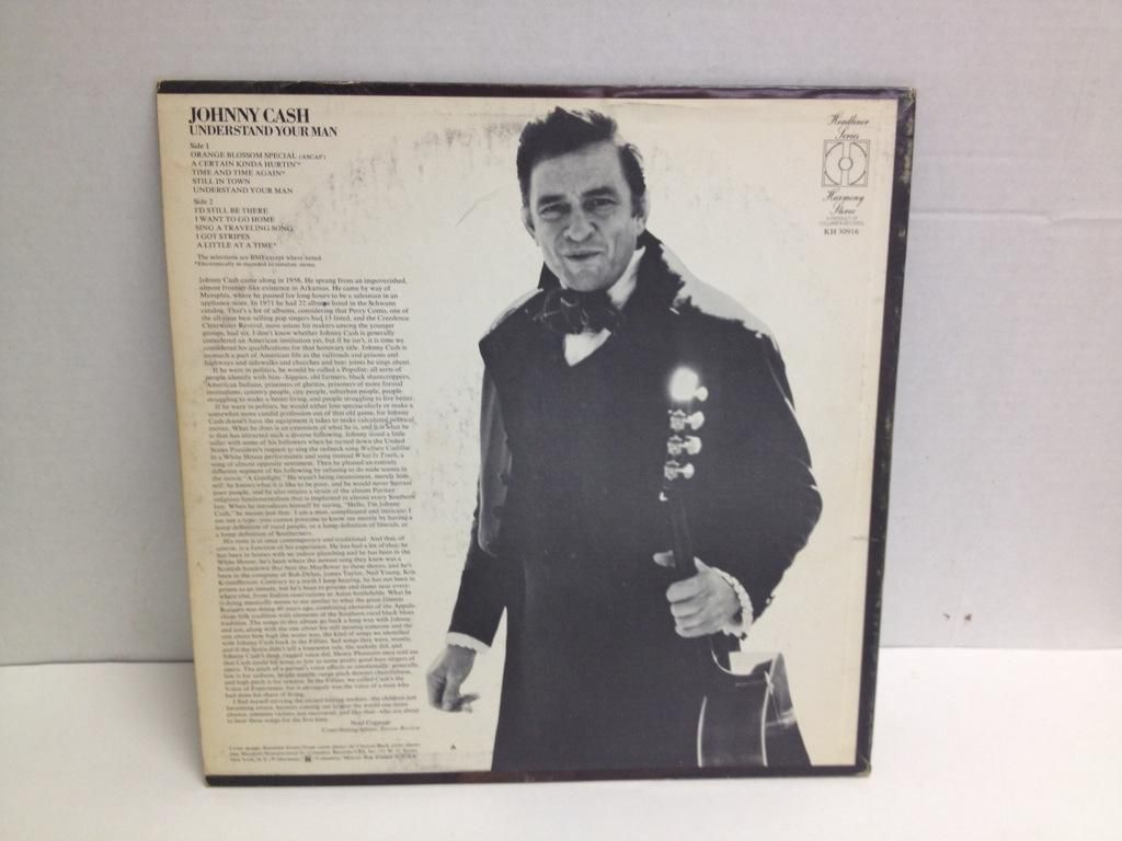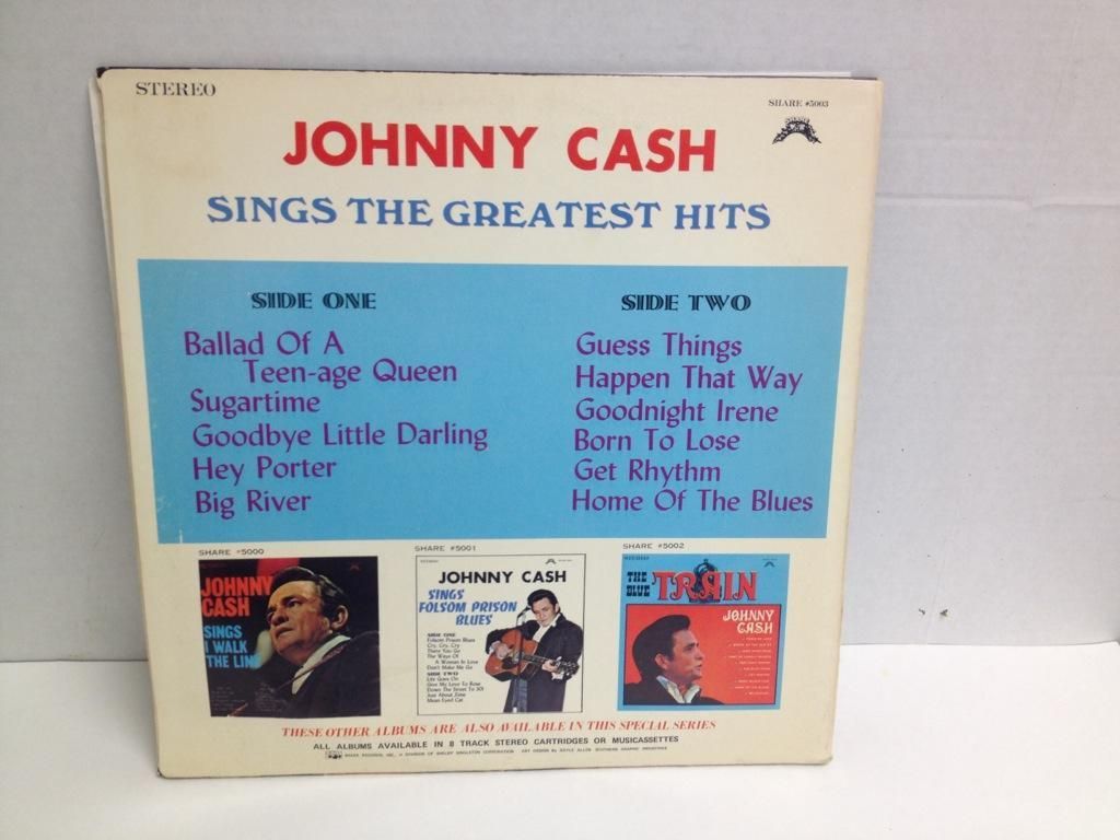 Harmony KH 30138; The Walls of a Prison; Grade Mint--/Mint--, Harmony KH 30916; Understand Your Man; Grade VG++/VG++, HarmoneyHS 11342; This is Johnny Cash; Grade VG++/VG++, Nashville NLP 2059; Various Artist; VG+/VG-, Hilltop JS/6101; Rock Island Time; Grade VG+/VG-, Share #5002; The Blue Train; Grade Mint--/Mint--, Share #5003; Johnny Cash Sings the Greatest Hits; Grade Mint--/Mint--, Design DLP-610; The Story of a Broken Heart; Grade Mint--/Mint--.