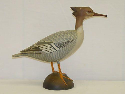 8" LAPHAM CARVED & PAINTED RED BREASTED MERGANSER HEN MINIATURE DECOY-SIGNED JAMES LAPHAM DENNISPORT MASS - OLDER REPAIR TO BEAK, IMPERFECTIONS